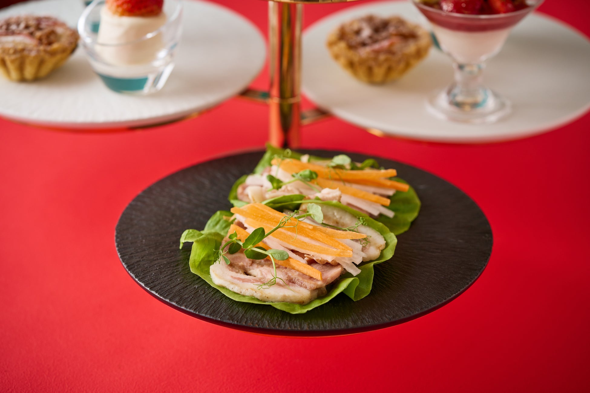 低温でじっくりと火を通した豚肩ロースと、寒くなり甘みの増した人参や大根、クレイジーピー(エンドウ豆の幼葉)をサンチュで包んでお召し上がりいただく、サムギョプサル風のセイボリー。りんごの爽やかな酸味にピリッとした生姜の風味を効かせたジンジャーアップルのソースや、黒にんにくのペーストを合わせました。