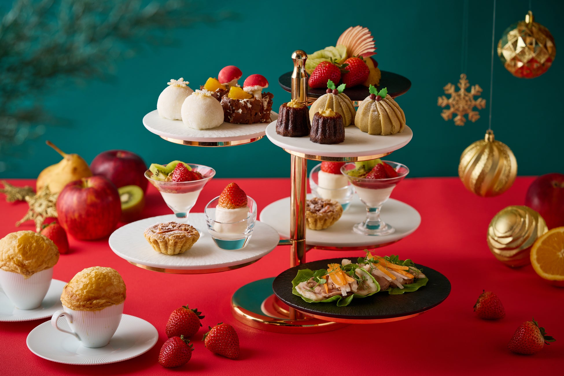 「クリスマスアフタヌーンティー」では、クリスマスにぴったりの多彩なスイーツをご用意しております。キャンドルをイメージしたいちごのショートケーキや、国産柑橘を使った自家製マーマレードとチョコレートクリームのブッシュ・ド・ノエルなど、旬のフルーツをふんだんに使用したクリスマス限定のスイーツが、6段のスタンドを華やかに彩ります。