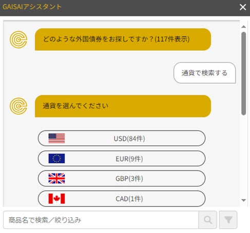 チャット形式で項目を選択し、条件に合致する外債を絞り込み、表示いたします。