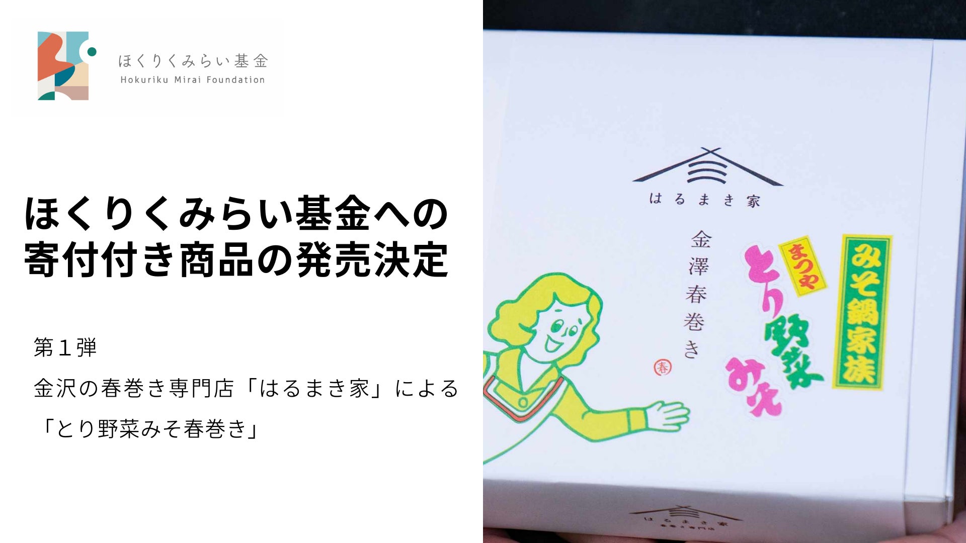 公益財団法人ほくりくみらい基金(所在地:石川県金沢市、代表理事:永井三岐子)は北陸初の春巻き専門店「はるまき家」(所在地:石川県金沢市、代表:佐藤大輔)と連携し、「はるまき家」が8月30日より販売を開始する新商品「とり野菜みそ春巻き」の売り上げの一部が、ほくりくみらい基金への寄付となる取り組みを開始します。
