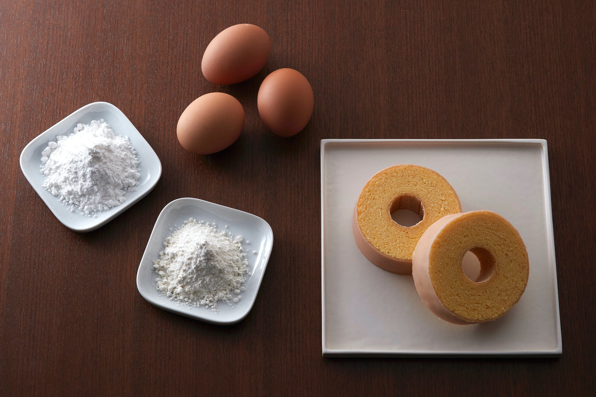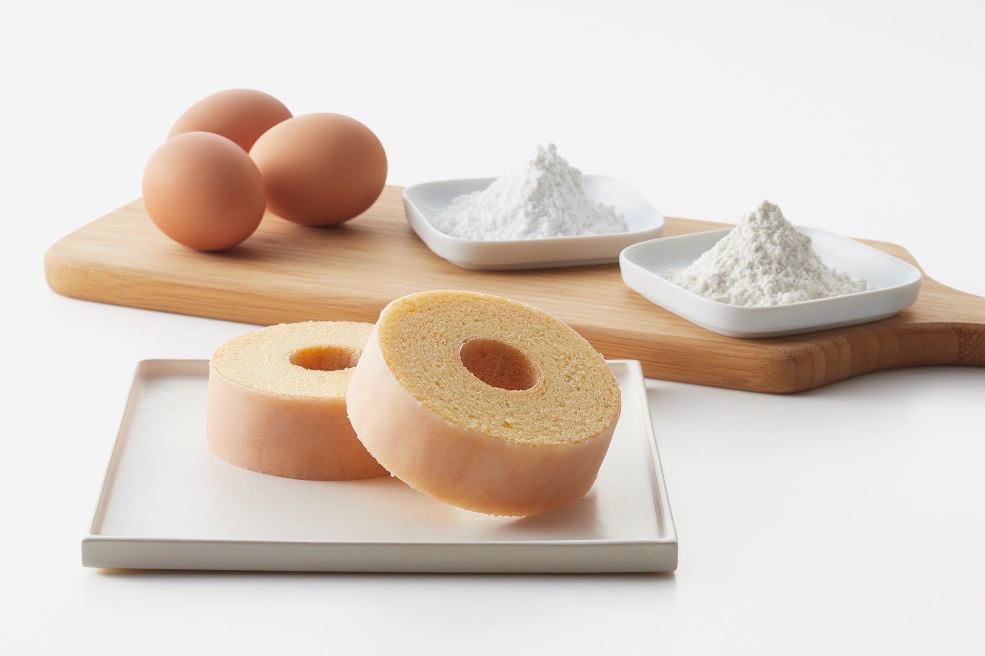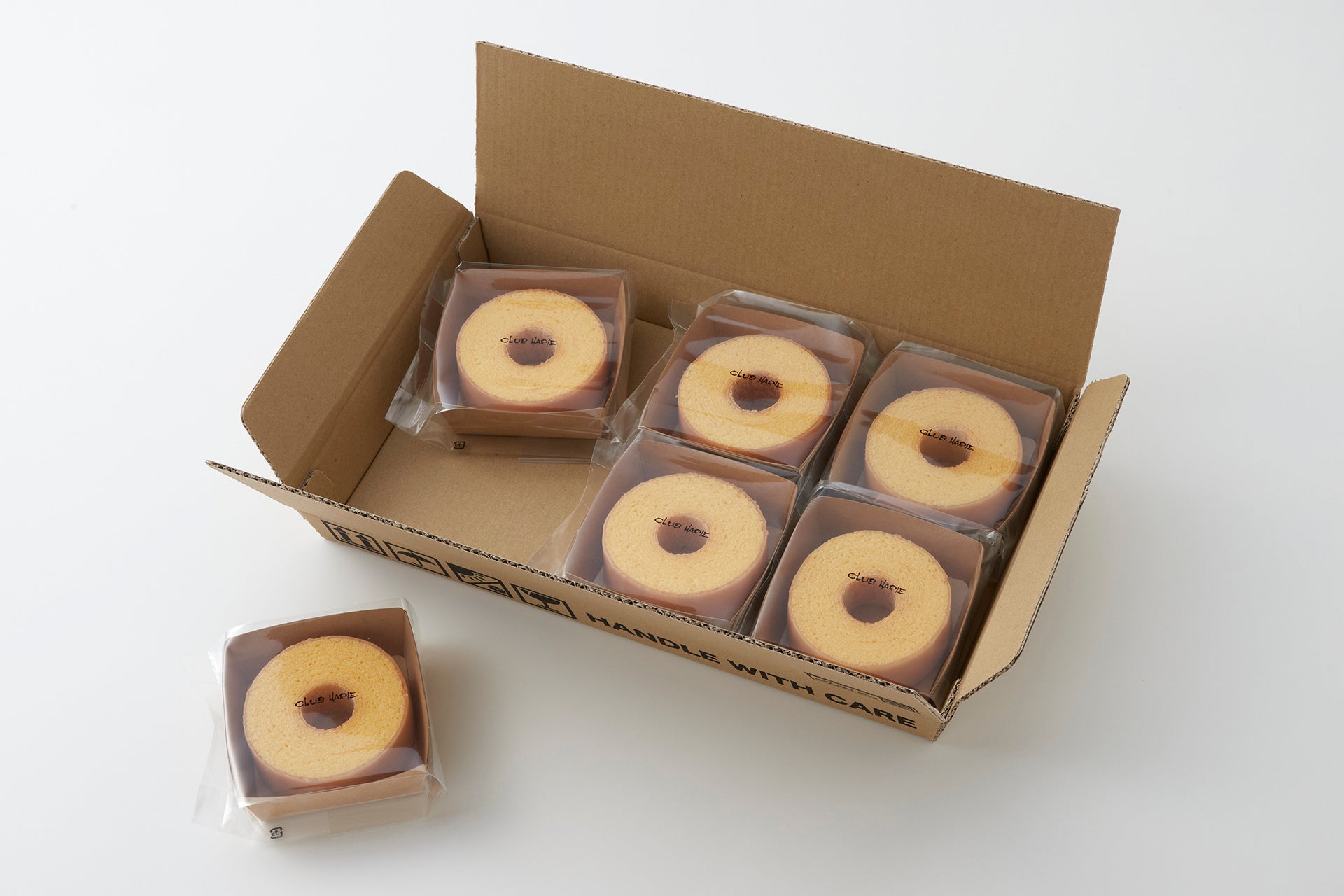 バームクーヘンの原材料としてクラブハリエでは小麦粉を使用していますが、「近江八幡バームクーヘンmini」では創業以来初めて米粉を使用しました。もち小麦や米粉を使用したことでうまれる今までのバームクーヘンとは異なる食感や味わいをぜひお楽しみください。