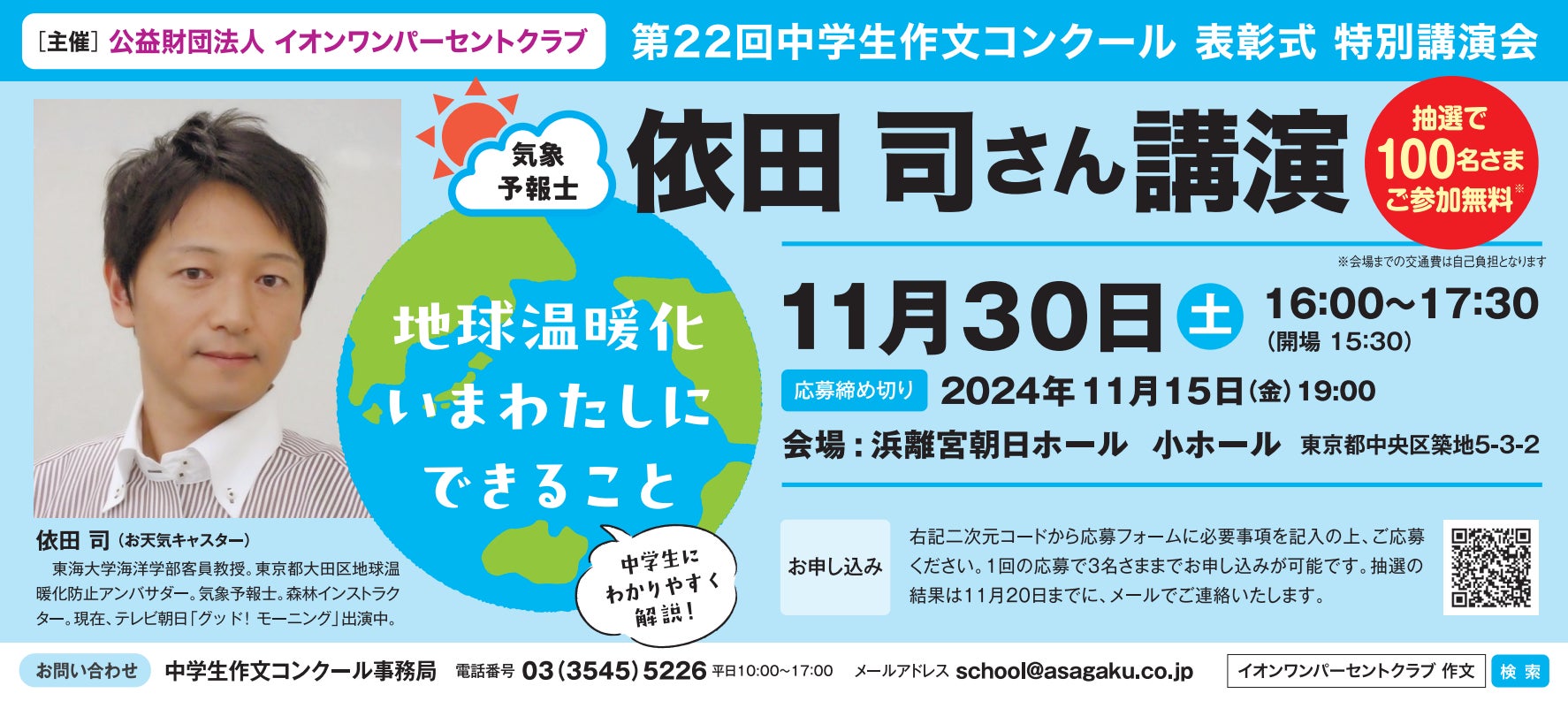 公益財団法人イオンワンパーセントクラブは、第22回中学生作文コンクールの表彰式と特別講演会を2024年11月30日(土)に浜離宮朝日ホール小ホールにて開催します。