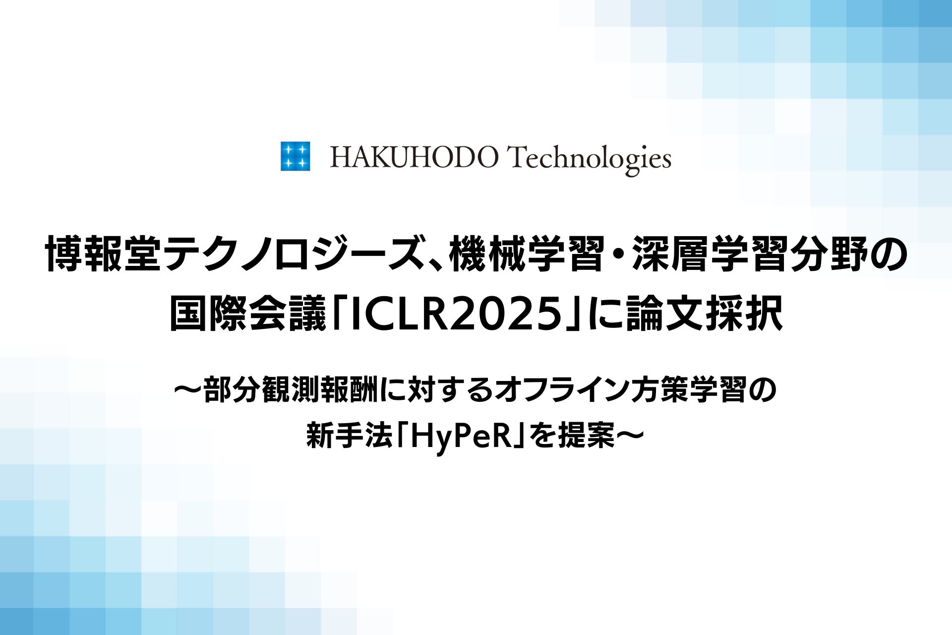 株式会社博報堂テクノロジーズ(東京都港区、代表者:米谷修)は、国際学会「ICLR 2025 (International Conference on Learning Representations)」において、当社の研究者が共著者として参加した論文「A General Framework for Off-Policy Learning with Partially-Observed Reward」が採択されたことをお知らせいたします。