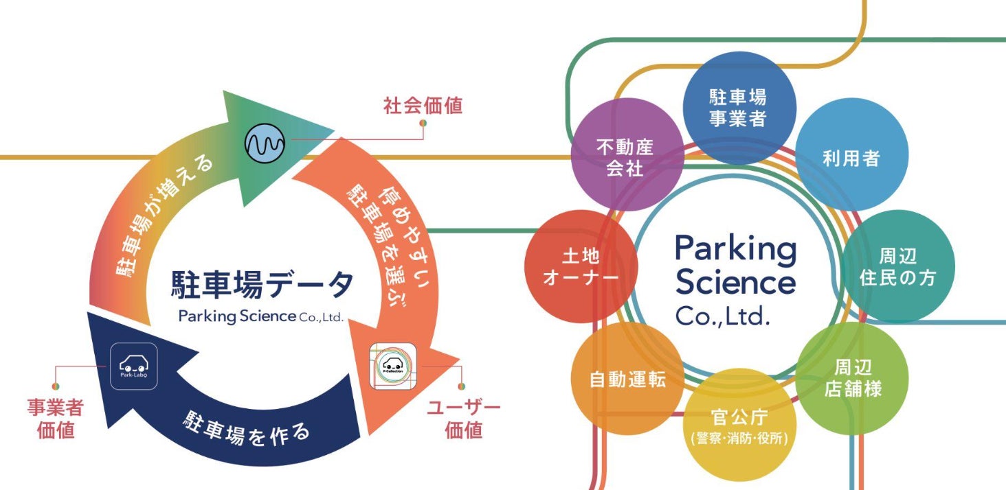 Mission・Visionのもと、パーキングサイエンス株式会社は「駐車場データ」を中心に、 駐車場事業者様、土地オーナー様、不動産会社様、周辺住民様、利用者様、店舗様、官公庁様、自動運転関連企業様といったステークホルダーと価値を共有し、データ循環型のビジネスモデルを実現してまいります。このMissionは、将来的な自動運転社会やスマートシティ構想にもつながるものであり、私たちはその“起点”としての役割を果たしてまいります。
