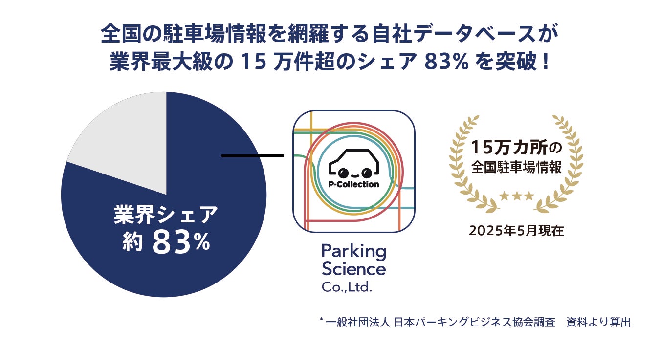 2025年5月時点でパーキングサイエンス株式会社が運営管理している駐車場データベースの規模が、時間貸し駐車場データ82,764件・予約駐車場データ70,052件・合計データ・152,816件となり、全国15万件を超えたことに加え、時間貸し駐車場データについては、一般社団法人日本パーキングビジネス協会が駐車場便覧内で公表している時間貸し駐車場個所数99,200件に対し網羅率83%を突破いたしました。