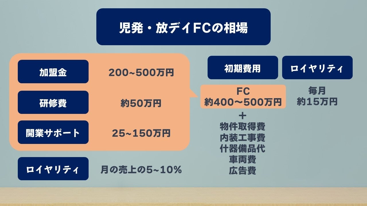 事業所を立ち上げる際に必要なノウハウを得るためにFC加盟する場合、加盟金だけでも200万円から500万円が必要であり、さらに毎月のロイヤリティの支払等、多額の資金が必要です。