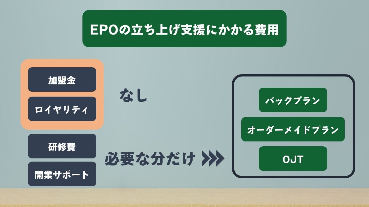 EPOが実施する立ち上げ支援は、フランチャイズによるものとは大きく異なります。新規事業を始めたい方1人1人の困難感やリソース、予算に合わせたオーダーメイドの立ち上げ支援であるため、資料だけでは伝わり難い箇所がありました。