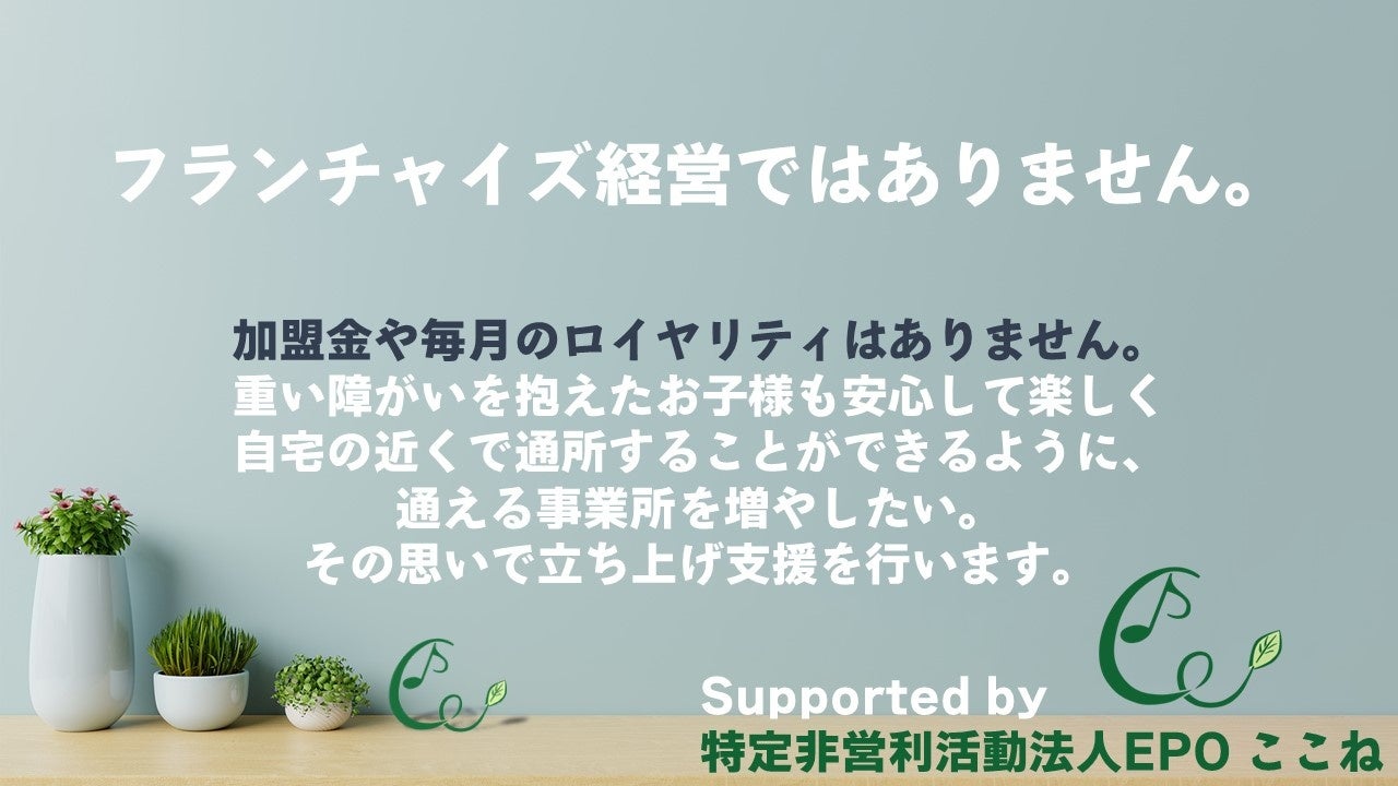 医療的ケア児や重症心身障がい児といった、より専門的な支援が必要な障がい児への支援の充実を図り、障がいの特性に関わらず地域で安心して暮らし育つことができる環境整備を進めるため、一般的なFC(フランチャイズ)加盟よりも低価格・ハイクオリティな事業所開設・運営のサポートを行います。
