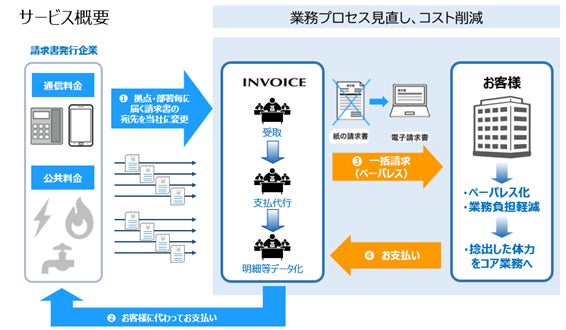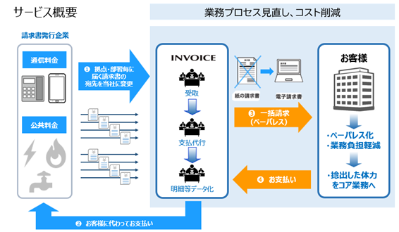 毎月、事業社ごと、拠点ごと、利用期間ごとに届く、通信費や水道光熱費の請求書をインボイスがお客様の変わりに受領。お支払いを代行し請求書を電子化してオンラインでお届けするサービスです。