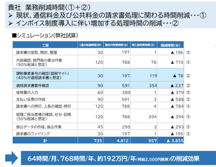 (株)インボイスの一括請求サービスを活用することで、支払業務の簡素化や部門仕訳の自動化、通信契約の見直しやインボイス制度への対応が可能となるため、請求書の処理にかかる時間が、年間で約768時間削減(独自シミュレーション)となります。