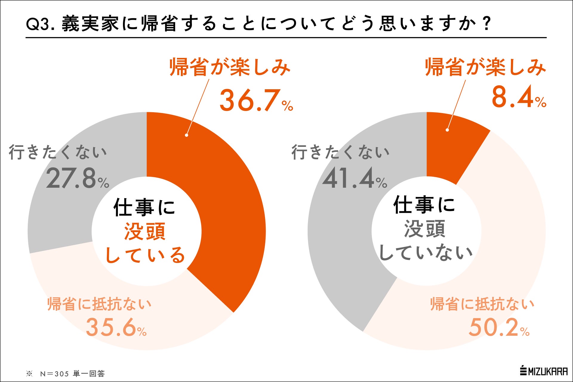 上述の内容を裏打ちするデータもあります。同じく男性に対して「義実家に帰省することについてどう思いますか」と質問したところ、仕事に没頭している男性は、そうでない男性の4.4倍も義実家への帰省を楽しみに思っています(36.7% vs 8.4%)。