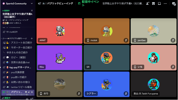 Sports3のDiscord内では、アスリートとファンの交流が活発に行われています。例えば、今回の企画のように、アスリートがDiscord内で実況を行いながら一緒にスポーツの大会を鑑賞するオンラインイベントや、実際にSports3のアスリートが出場する大会を現地とオンライン同時開催でみんなで応援をするイベントなどを定期的に開催していく予定です。