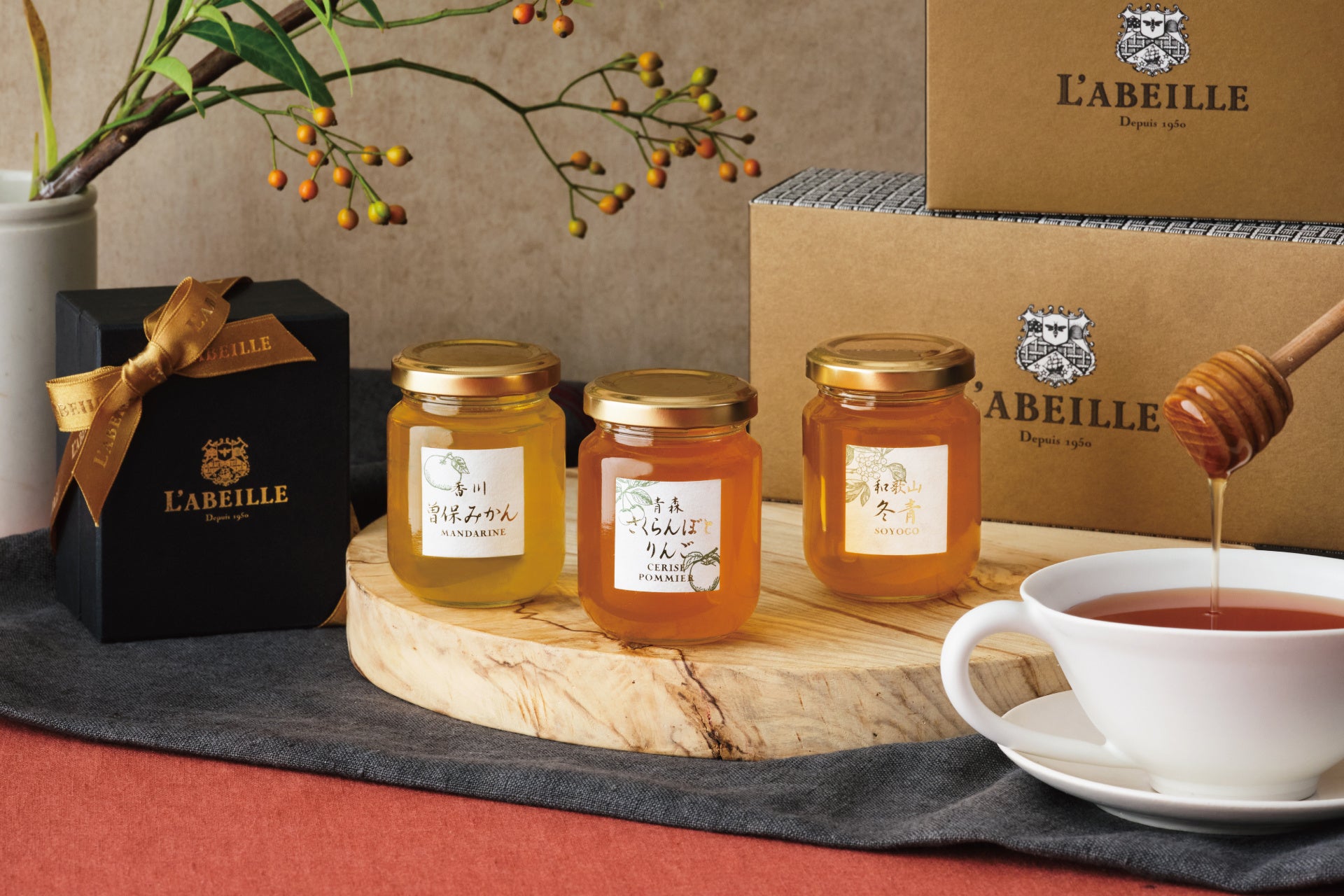 たっぷりのラベイユハニーで国産ゆずを煮詰めた「はちみつコンフィチュール ゆず」や、爽やかなゆずの香りがきいた「はちみつドリンク ゆず」とセットにして、健康を気遣う大切な方への冬のギフトや帰省土産にどうぞ。