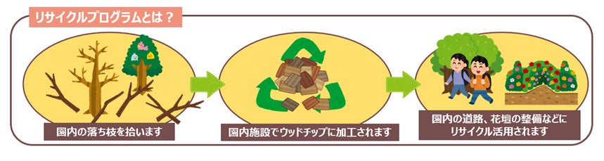 本活動は園内管理では手が回らない落ち枝を拾うリサイクルプログラムの一環であり、収集した落ち枝は園内の加工所でウッドチップ化され、敷地内の道路や花壇など公園の整備に活用されます。落ち枝を拾い集め利用することにより、公園の美化や転倒した際の怪我の防止にもなり、最終的には樹木のリサイクルに繋がります。