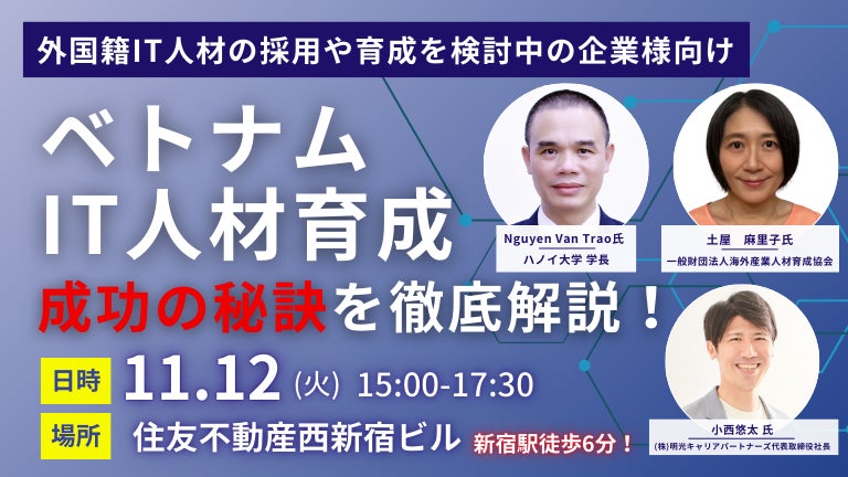 個別指導の「明光義塾」を全国展開する株式会社明光ネットワークジャパン(本社:東京都新宿区、代表取締役社長:山下 一仁)と、株式会社明光ネットワークジャパンの子会社で、外国人を対象とした教育研修サービス、外国人材紹介サービスを展開している株式会社明光キャリアパートナーズ(本社:東京都千代田区、代表取締役社長:小西 悠太)は、「ベトナムにおけるIT人材の育成と高度人材の教育をテーマとしたセミナー」を2024年11月12日に共同開催することをお知らせいたします。