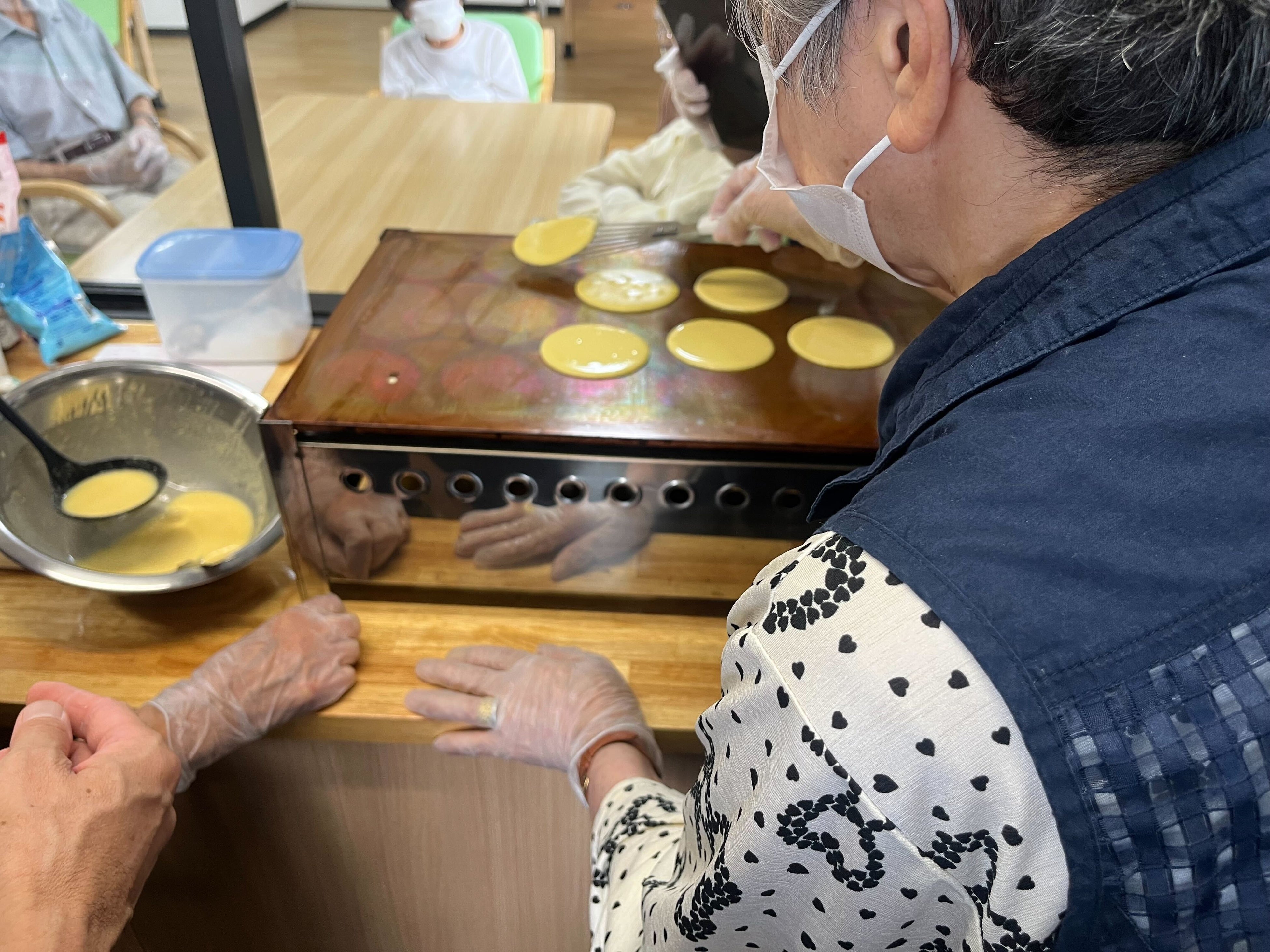 しっとりふっくら生地になるよう絶妙な粉の配合から始まり、卵割り〜粉ふるい〜混ぜるまでを利用者様が担当。その後、心をこめて一枚一枚丁寧に焼いていきます!