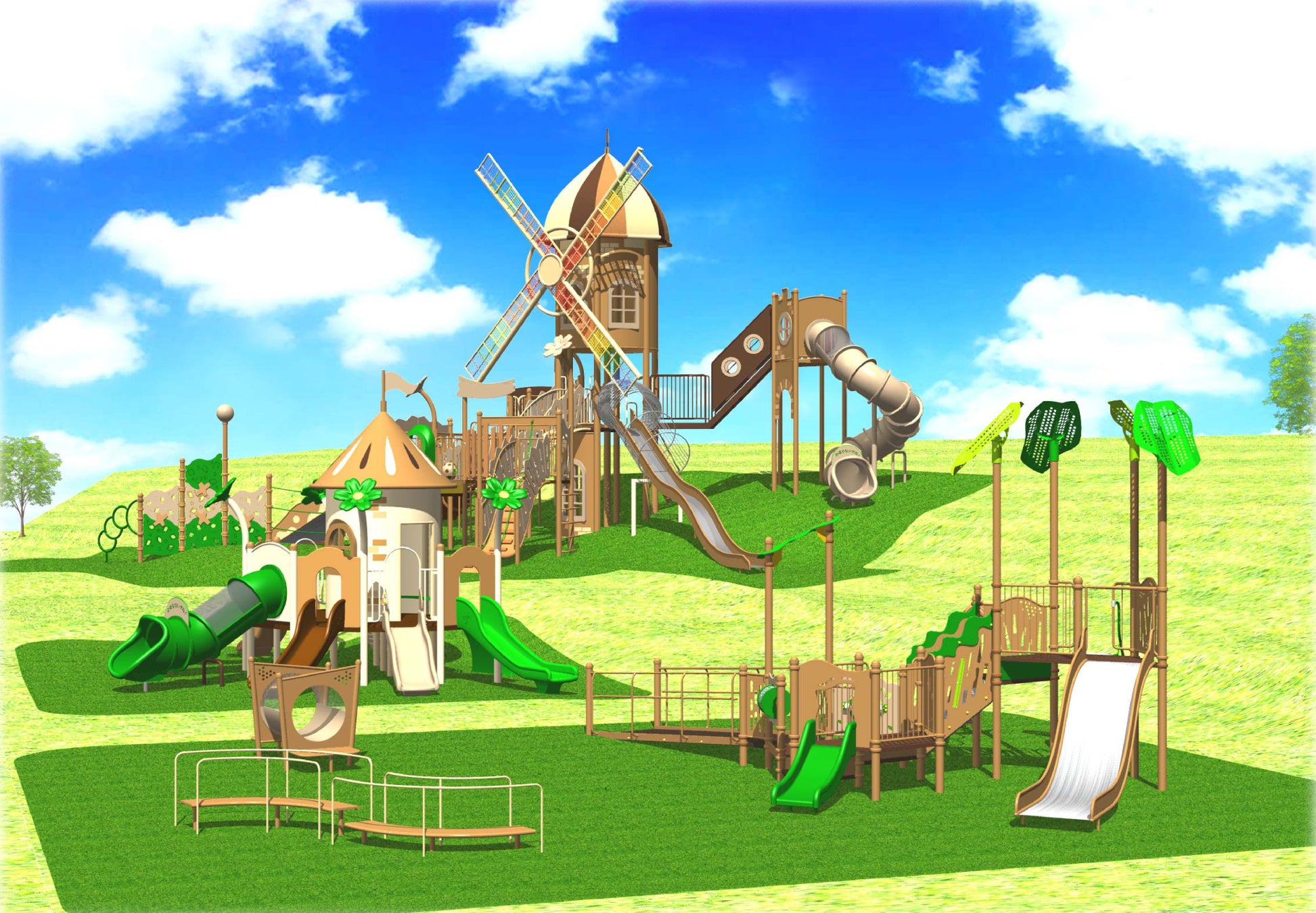 メインとなる大きな風車がシンボルの巨大遊具には滑る・渡る・登る・覗く・転がすといった5つの 要素を一つの遊具に詰め込んでおり、様々な遊びが展開される構成のため、冒険心・好奇心を刺激し、何度遊んでも楽しめる遊具になっています。隣接する2つの遊具は、小さなお子様でも楽しめる小型の遊具です。さらに、小学校高学年のお子様まで幅広い年齢層が楽しめるように設計されています。