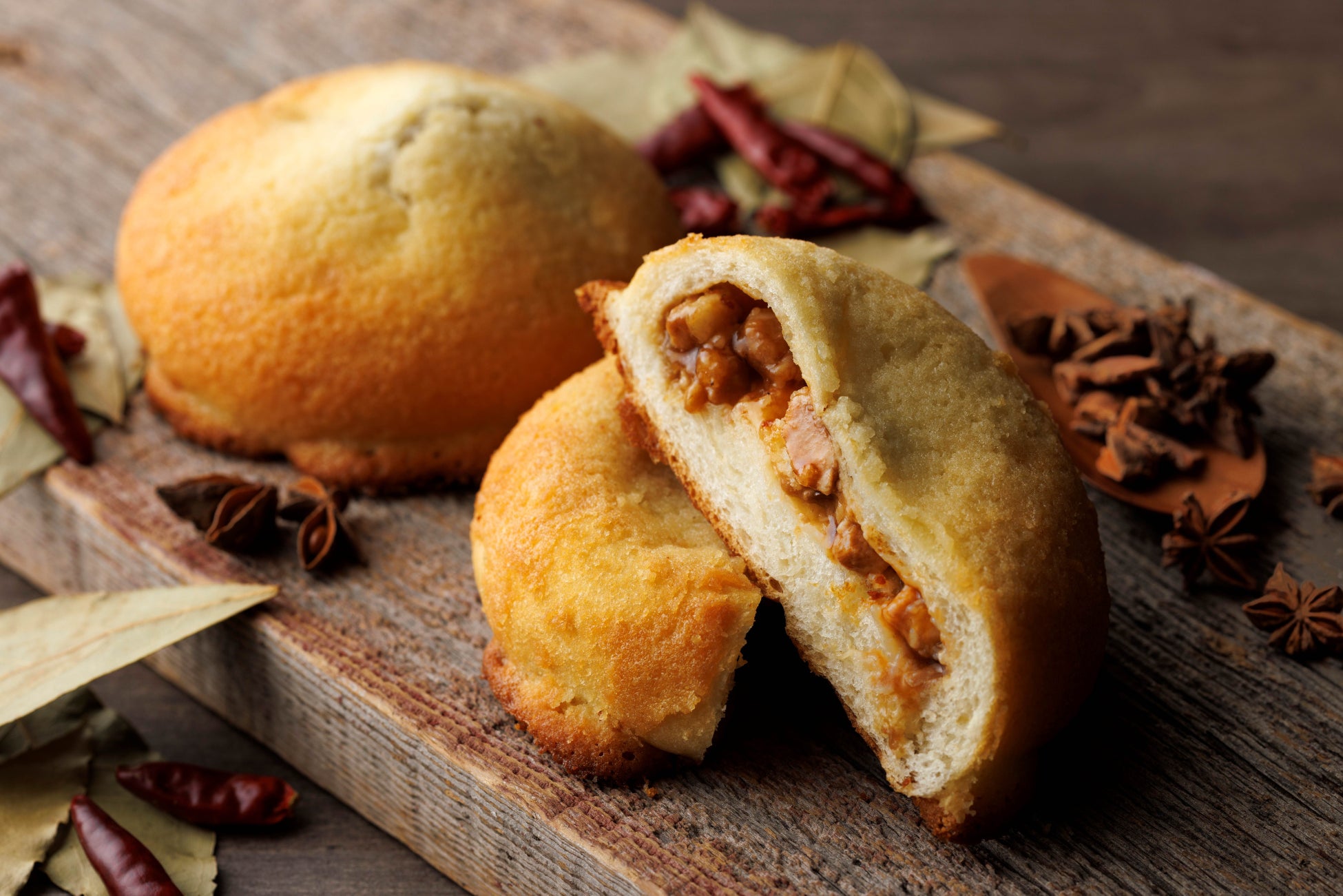 「トンポーロウブール」は、湯本富士屋ホテルの中国料理レストラン「桃華樓」特製のトンポーロウ(豚肉の中華料理)を餡にした、もっちりサクサク、甘しょっぱい味わいが特徴のパンです。豚肉をたまねぎ・にんじん・しょうが・ねぎなどの野菜と調味料・香辛料でじっくり煮込んだ特製の餡を、甘めのクッキー生地に包み、アーモンドクッキー生地で丸く(ブール)焼き上げた、湯本富士屋ホテルならではの一品です。