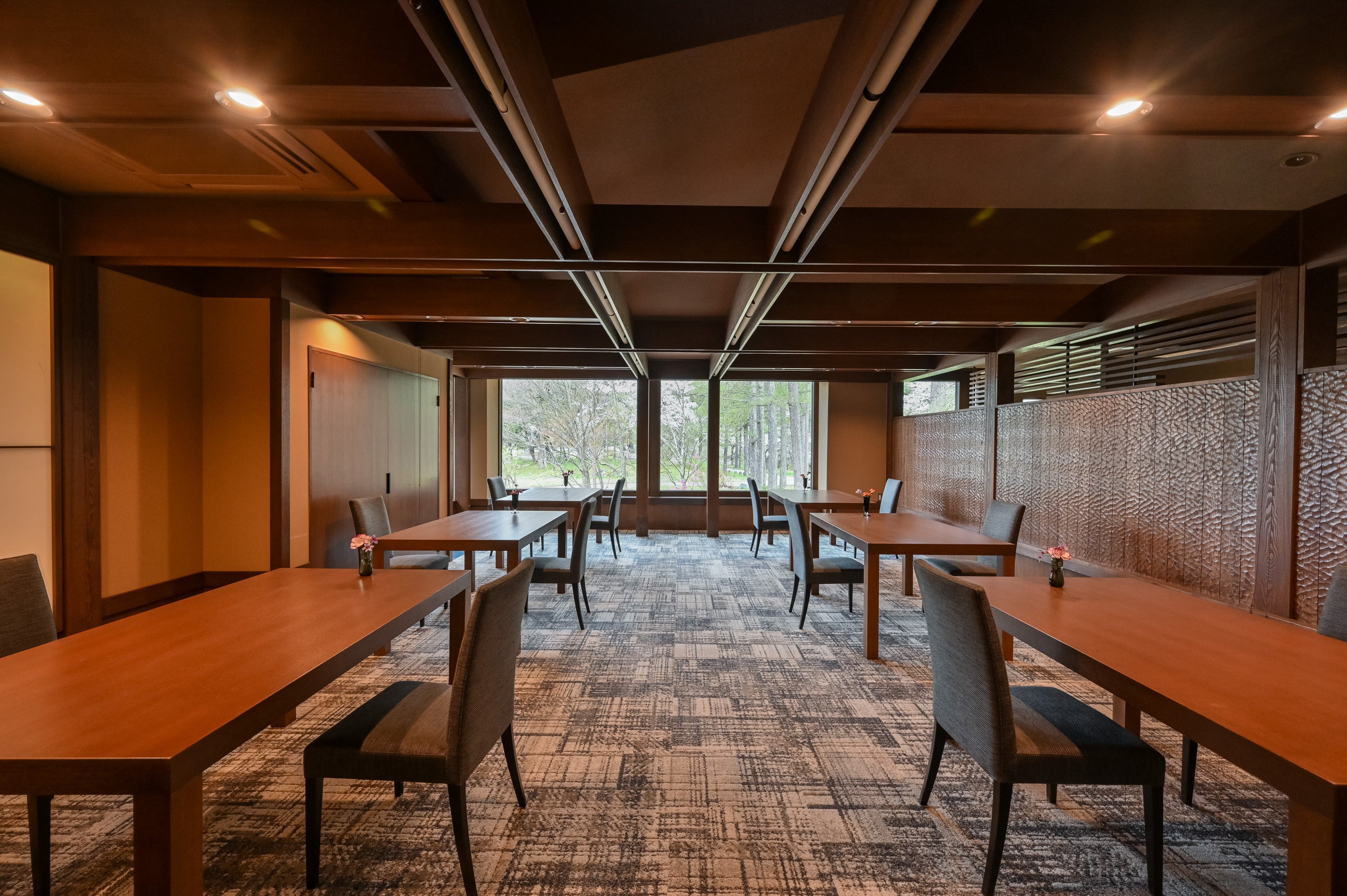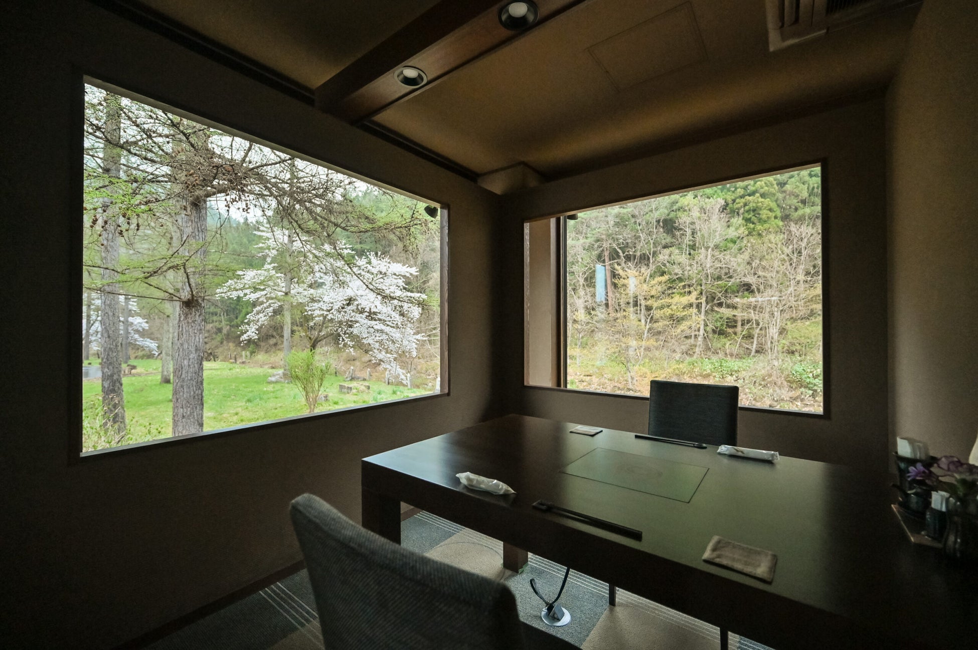 もともと、畳張りで小上がり席を設けていたお食事処は、今回のリニューアルで椅子テーブル席へと変わり、お客様がお履き物を脱がずにご着席いただけるようになりました。また、お食事中のお客様がより景観をお楽しみいただけるよう、すべてのサッシを改修しております。ぜひ、すみれ自慢のお料理と、自然が生んだ美しい景観をお楽しみください。