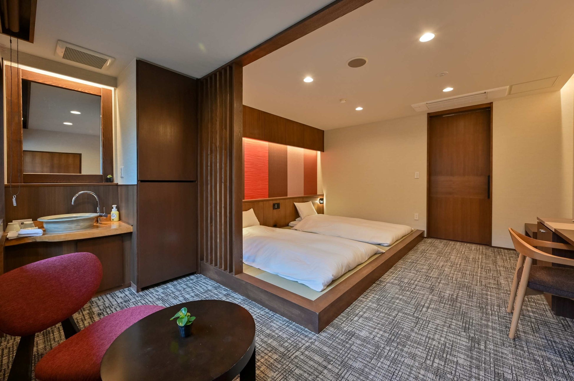 また、同じく8帖の和室だった「さくら」も和洋室にリニューアル。「さくらすみれ」の花をイメージしたデザインとなっており、ベッドではなく畳の小上がりに和布団をご用意させていただきました。また、床はカーペットになっております。