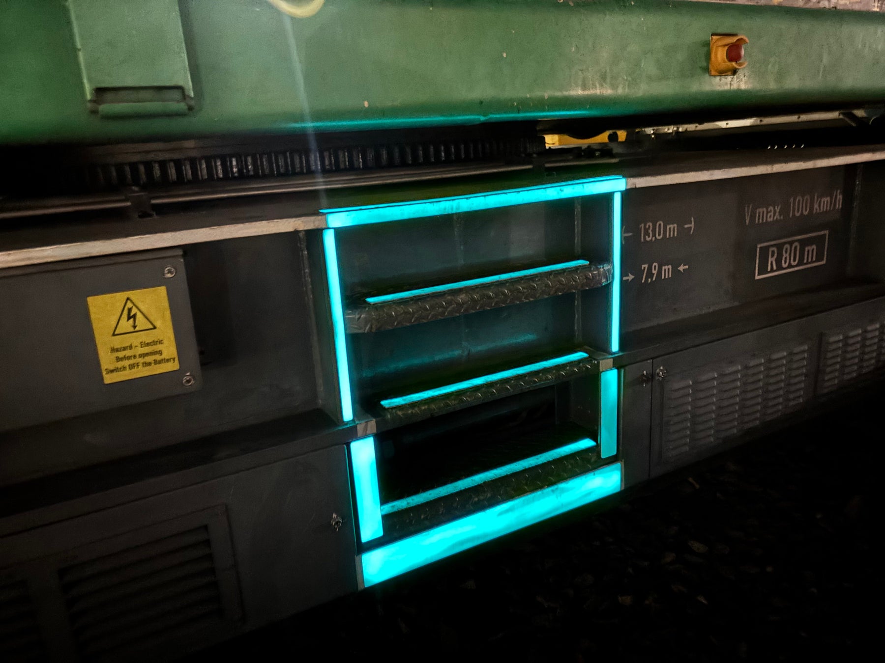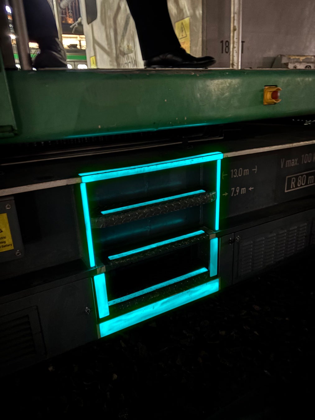 鉄道インフラの維持管理では、終電後から始発前にかけて多くの保守作業が行われます。これらの作業は暗所環境下で実施されることが多く、設備構造の視認性確保が安全管理上の重要な課題となっています。鉄道工事に活用される鉄道クレーン車では、夜間作業時に梯子や段差の位置が視認しづらく、乗り込み時の踏み外しや転倒といった作業リスクが存在しています。