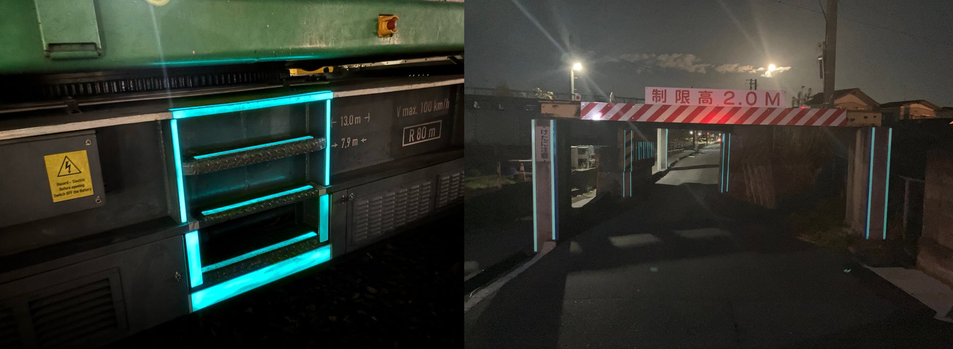 鉄道工事用車両乗り込み時の転倒リスク低減および鉄道橋の衝突事故対策を目的に、躯体構造を直感的に可視化する非電力安全技術を導入。実証実験を経て、暗闇環境を前提とした安全対策として現場運用が開始