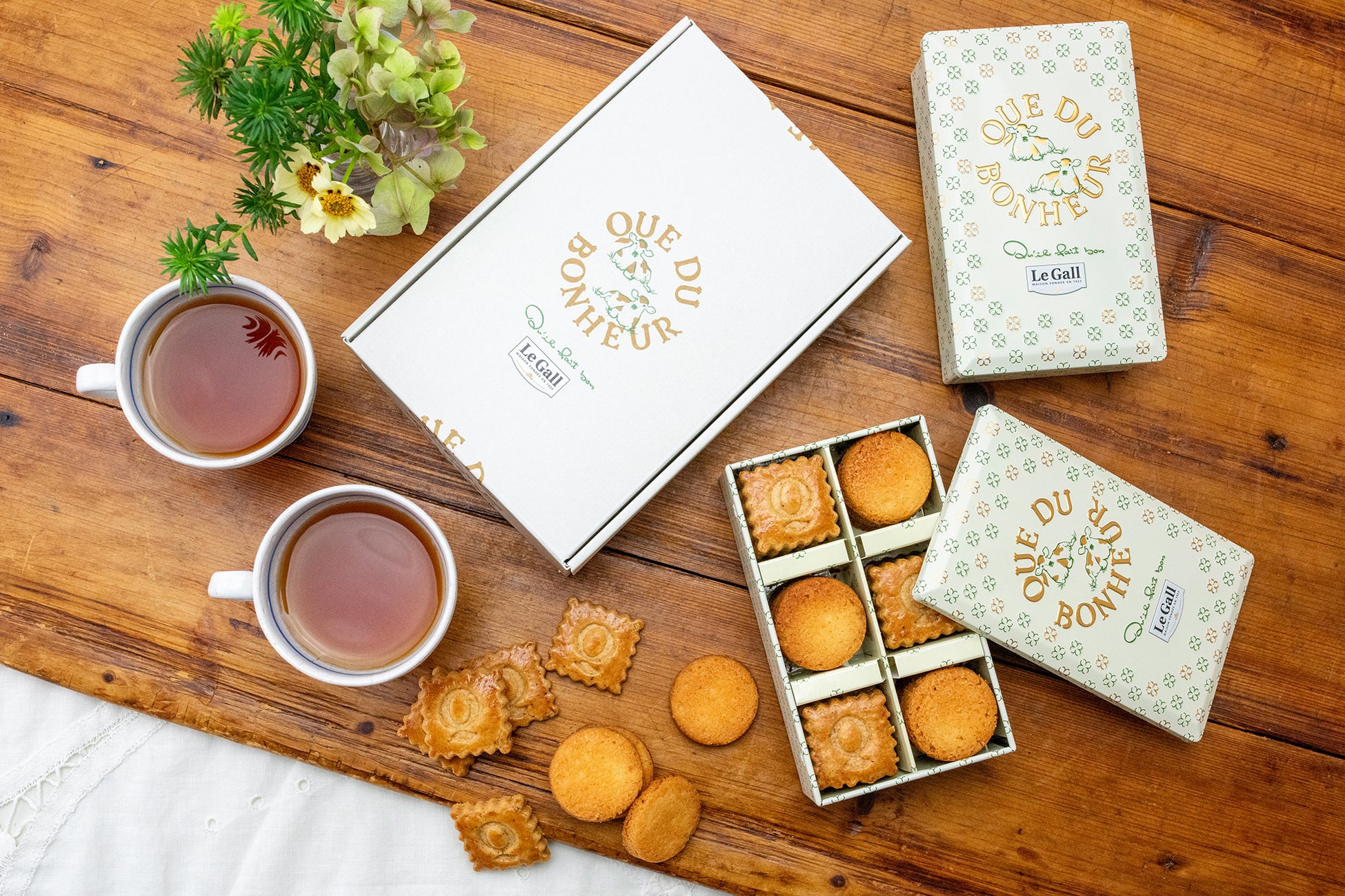 今回、新登場となる焼菓子「QUE DU BONHEUR」にはル ガールで新しく開発された無菌ドラムチャーン製法の前発酵バターを採用しました。特別な前発酵バターに、良質なフランス産小麦100%の小麦粉やゲランドの塩など選りすぐりの材料のみで作り上げたサブレとガレットです。ル ガールバターが持つミルクの豊かなコクと香りの余韻をたっぷりとお楽しみいただけます。