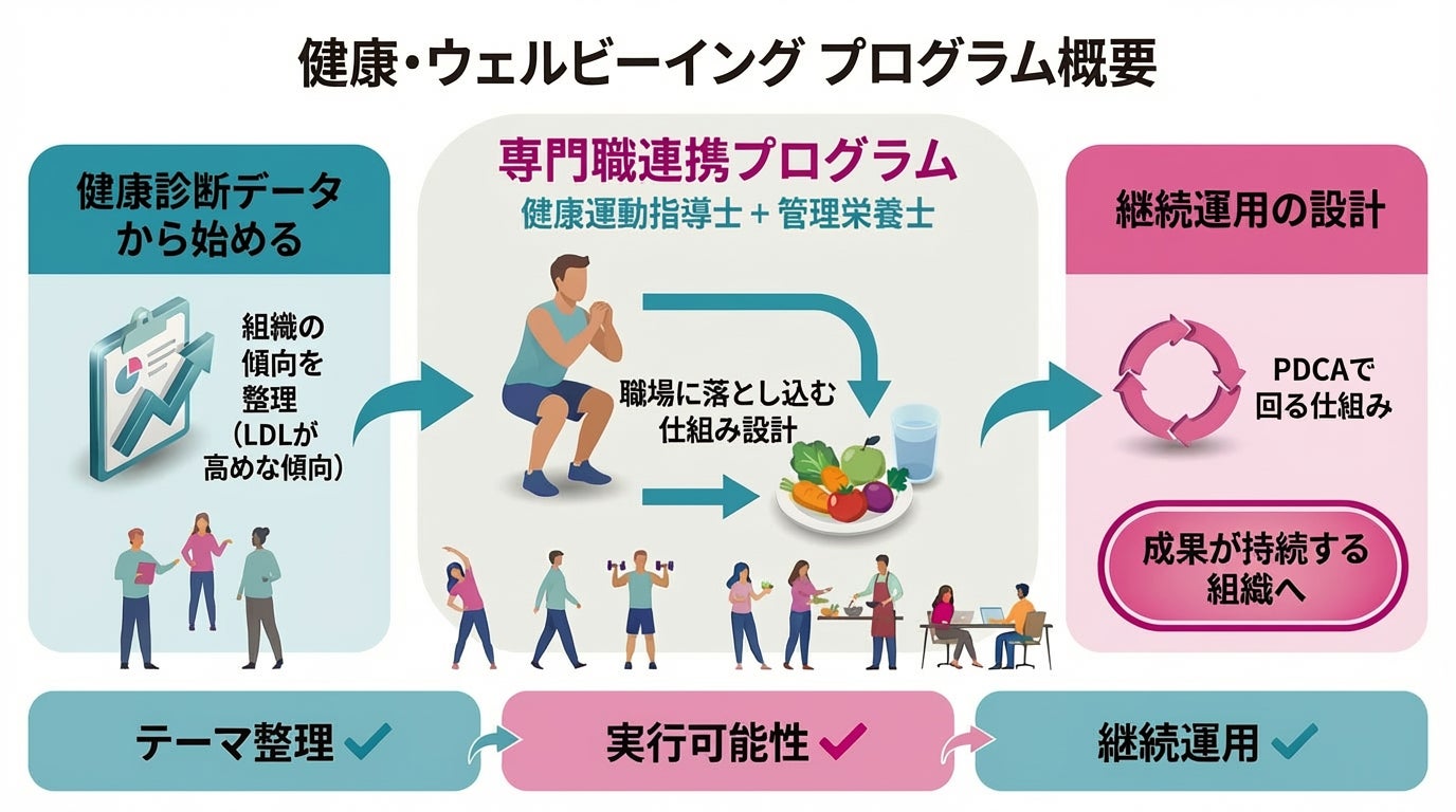 LDLが高めな傾向は、知識提供だけに閉じるほど、現場実装が難しくなりがちなテーマです。大切なのは、健康診断データを起点に、扱うテーマと順番を整理し、健康運動指導士と管理栄養士の役割分担を揃え、生活習慣の整え方を社内でまわす形に落とすことです。