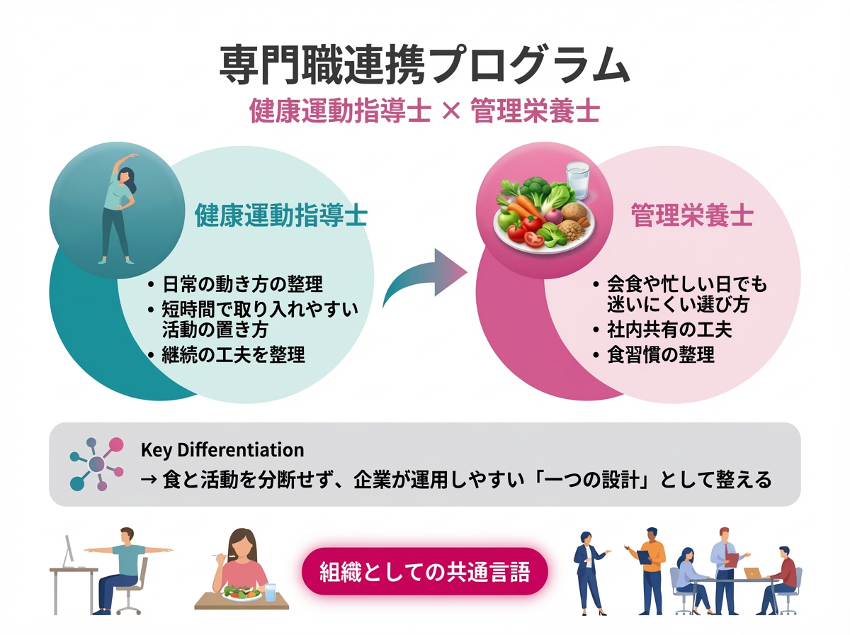 食と活動を分断せず、企業が運用しやすい「一つの設計」として整える点が特徴です。