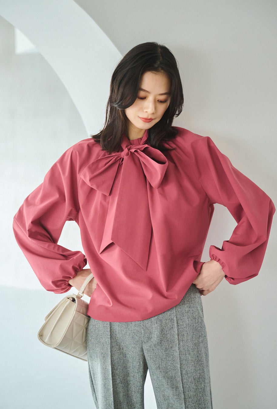 ボウタイを取り外すと構築的なタックブラウスに。ジャケットのインとしても大活躍。