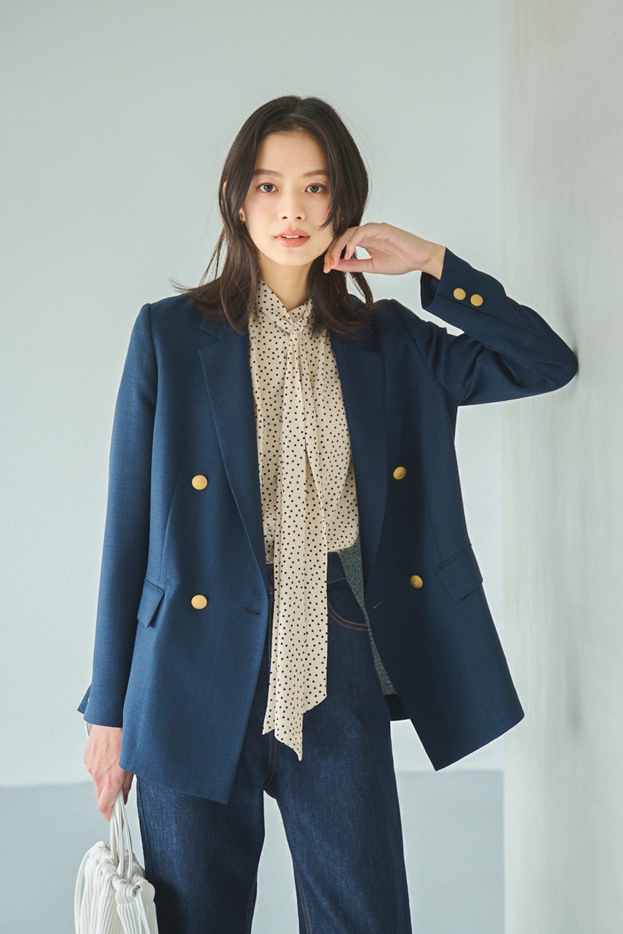 Jacket ¥35,200 / Blouse ¥17,600 / Denim ¥19,800 / Bag ¥19,800