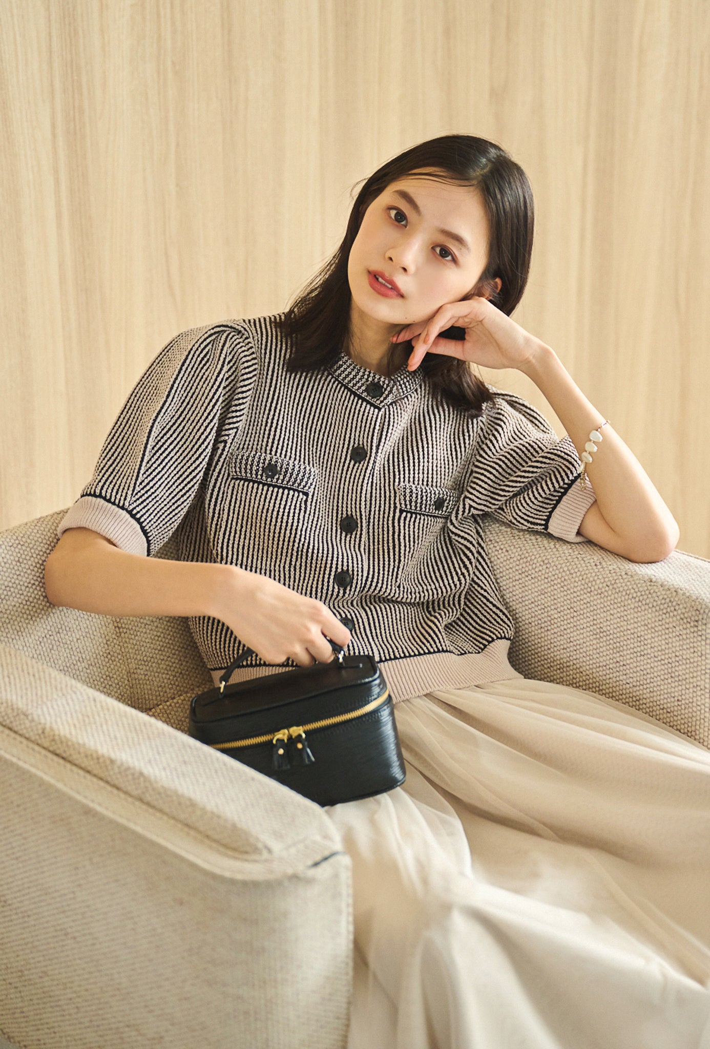 Cardigan ¥17,600 / Skirt ¥26,400 / Pouch ¥16,500 / Bracelet ¥6,380