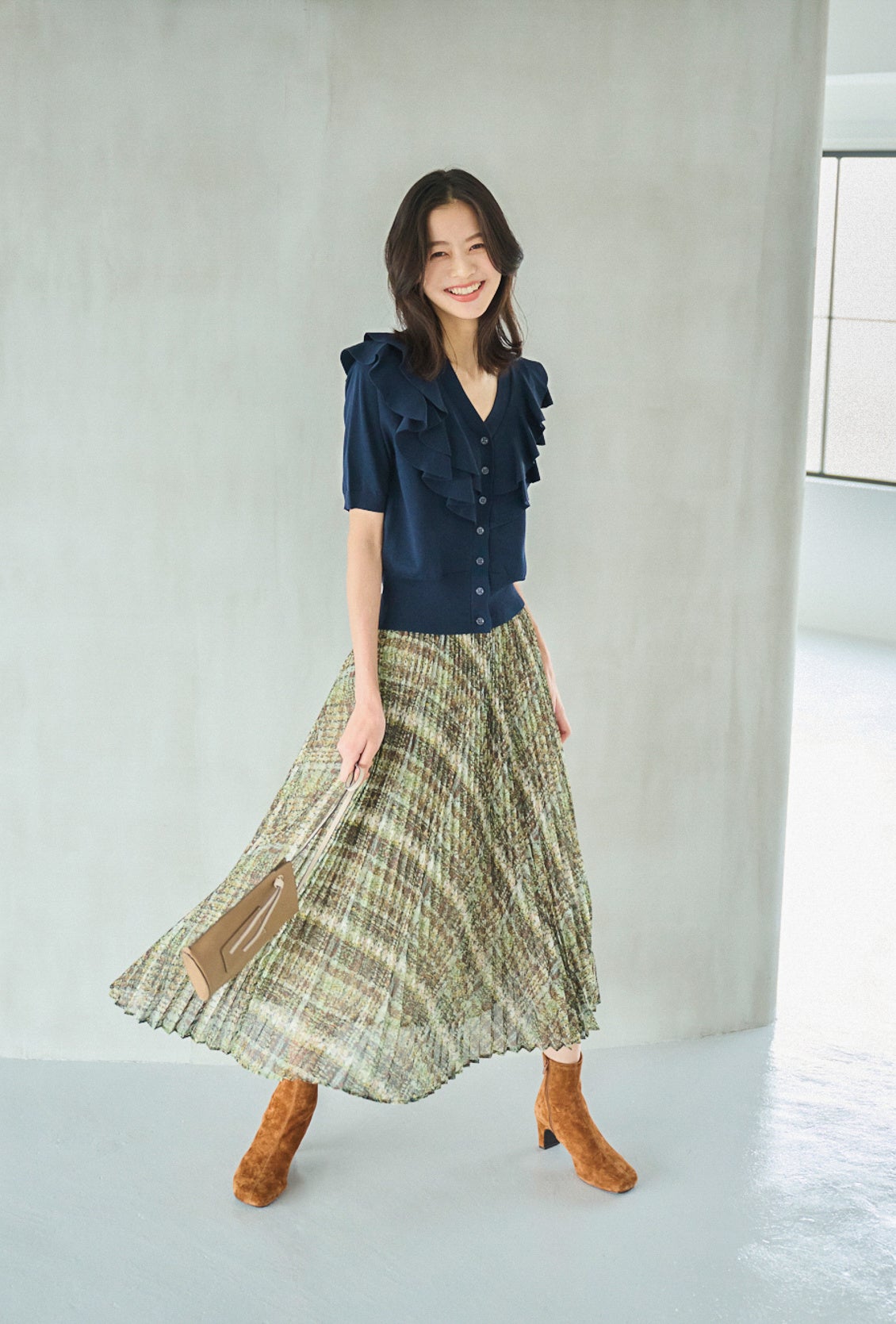 Knit ¥17,600 / Skirt ¥26,400 / Pouch ¥13,200 / Boots ¥37,400