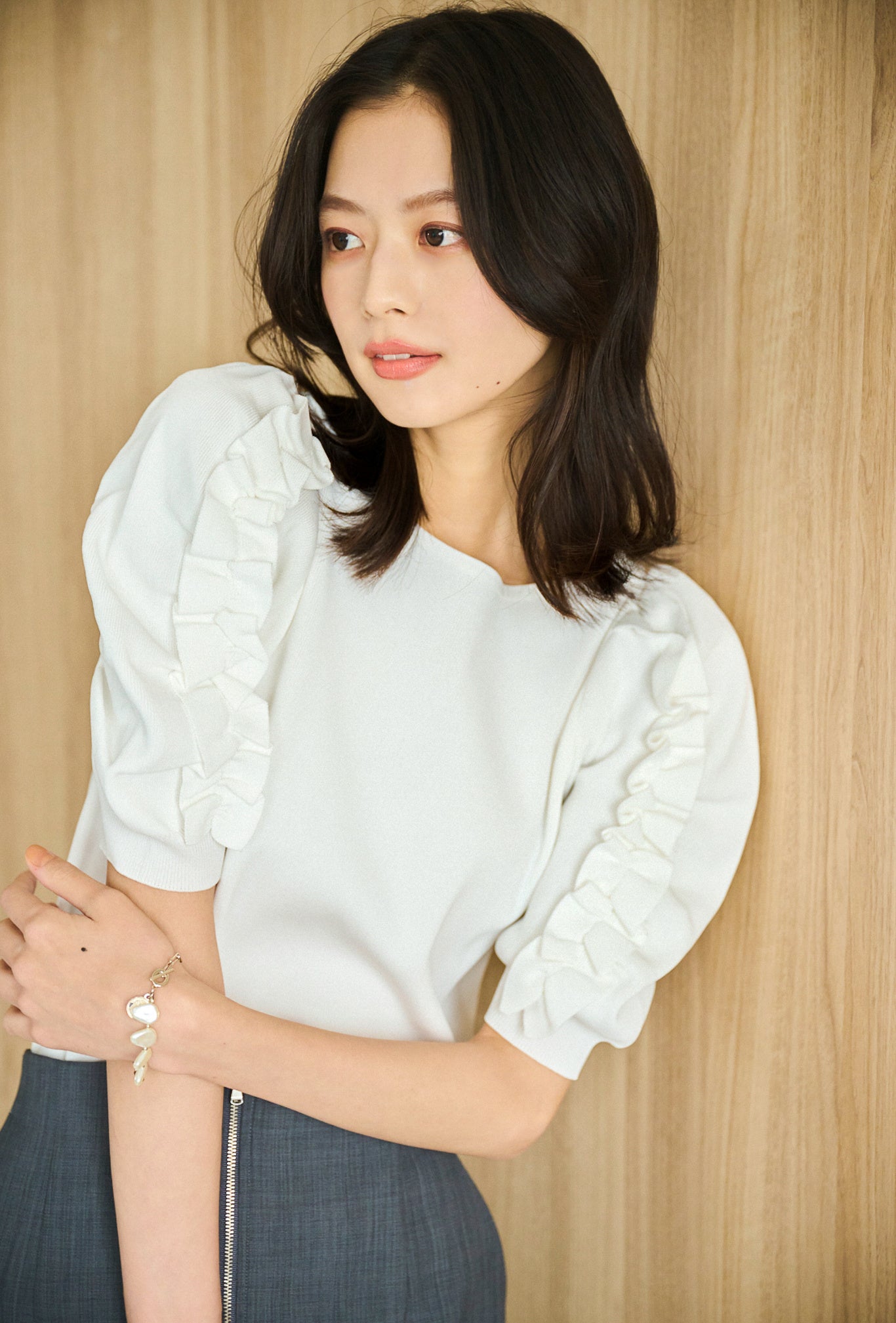 Knit ¥16,500 / Skirt ¥19,800 / Bracelet ¥6,380