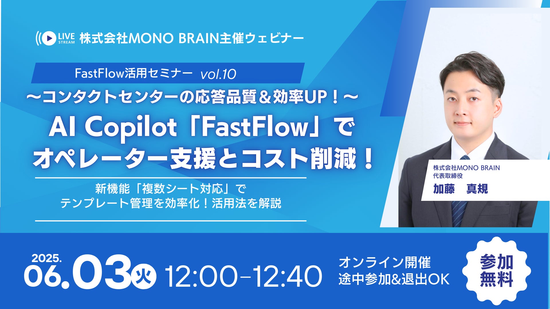 カスタマーサポート(CS)領域のAIソリューションを提供する株式会社MONO BRAIN(本社:東京都渋谷区、代表取締役:加藤真規)は、2025年6月3日(火)12時より、コンタクトセンター運営事業者様を対象とした無料オンラインウェビナー「「FastFlow」実践ウェビナー (vol.10)」を開催いたします。