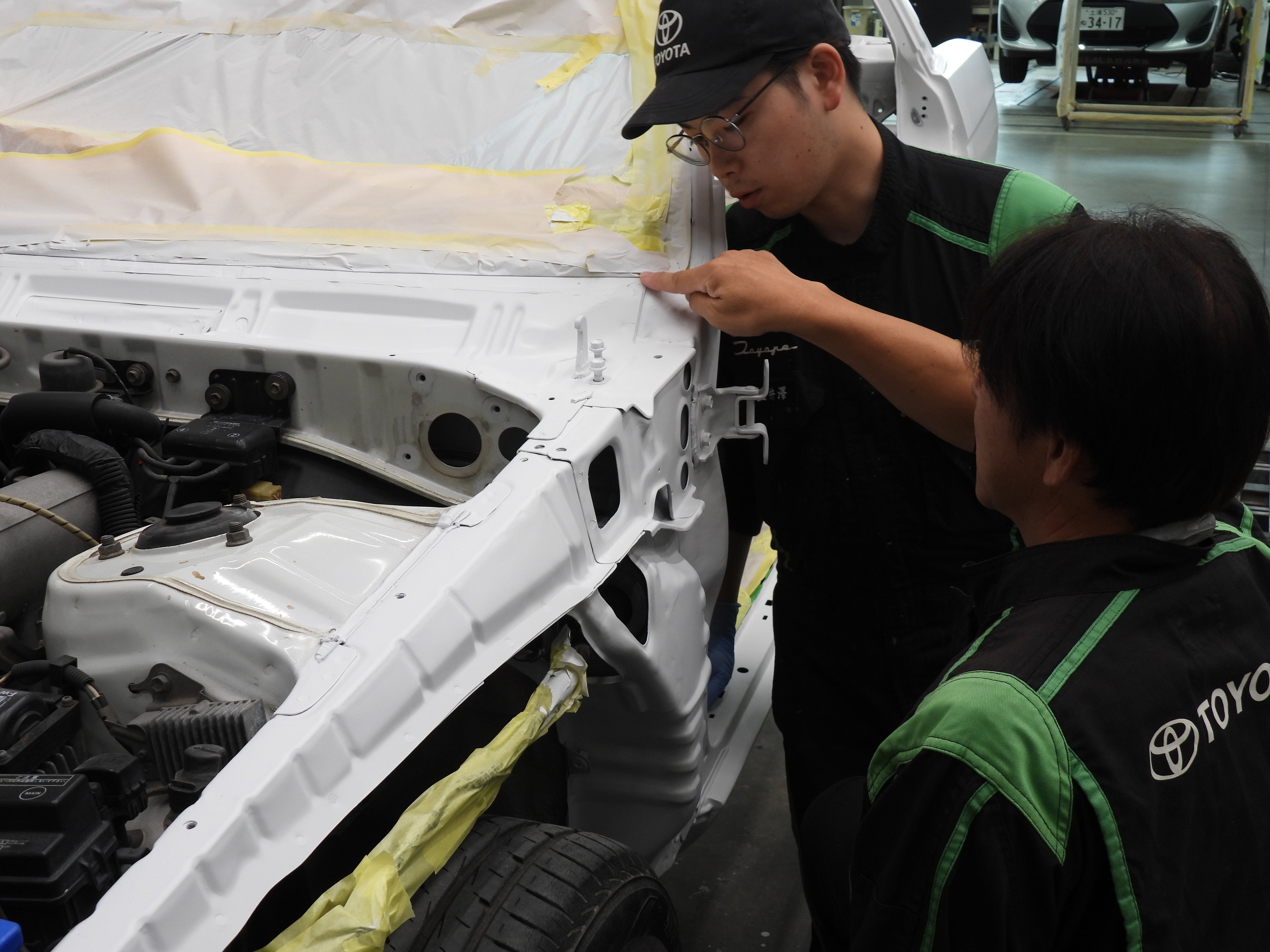 茨城トヨペットは、レストアを通じて「技術の向上」「技術の伝承」を掲げ、次世代への教育に取り組んでいます。近年、ボディカラーの多様化などによりソリッドカラーを広範囲に大きく塗る機会が少なくなっている中、同社では若手エンジニアがベテランの指導を受けながらマークⅡ(GX71)の全塗装を実践しました。