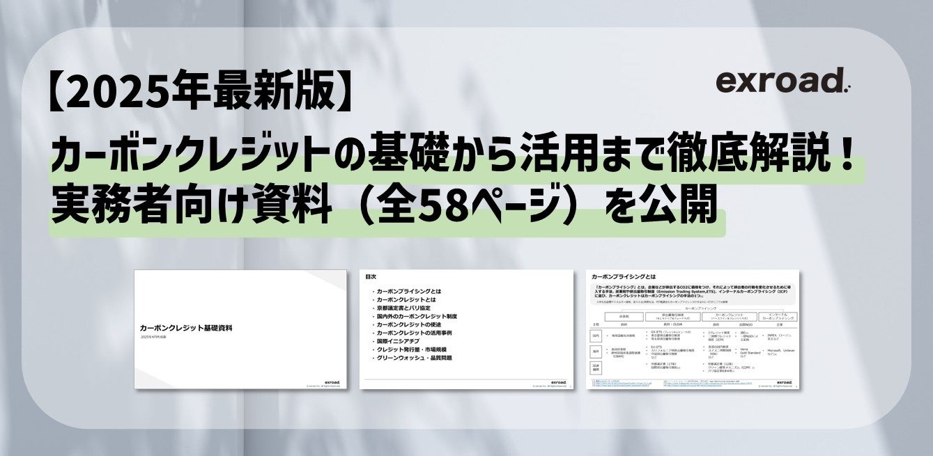 カーボンプライシング領域オールインワンデータプラットフォームを提供する株式会社exroad(エクスロード、本社:東京都港区、代表取締役:木村圭佑、以下当社)はこのたび、2025年最新版のカーボンクレジット基礎資料を公開いたしました。新年度を迎え、社内体制の変更や新任担当者の着任が多いこの時期に「カーボンクレジットについて基礎から体系的にキャッチアップしたい」という声にお応えし、実務者向け資料としてご提供します。先月に発表されたSBTiのネットゼロ基準草案もカバーしていますのでご関心ある方は是非ご活用いただければ幸いです。