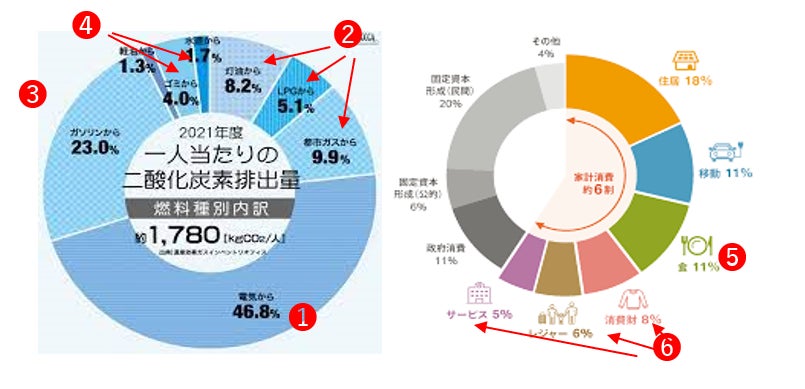 国民一人当たりのCO2排出量の23%はガソリン由来です。また、以下の図のようにGHGプロトコルScope3に基づくライフサイクルアセスメント(LCA)でのカーボンフットプリント(CFP)では6%をレジャーが占めています。