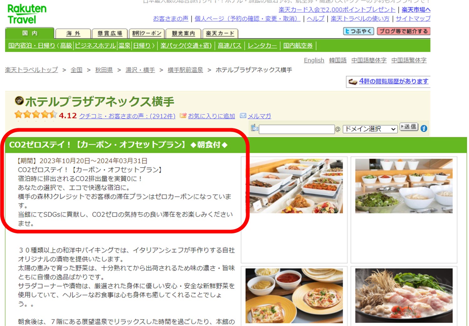 具体的には、まずホテルアネックス横手様に、秋田産のJクレジット証書を購入いただき、「CO2ゼロステイ!【カーボン・オフセットプラン】」として、旅行予約サイト(楽天トラベル)及び自社サイトで試験的に実際に販売頂きました。