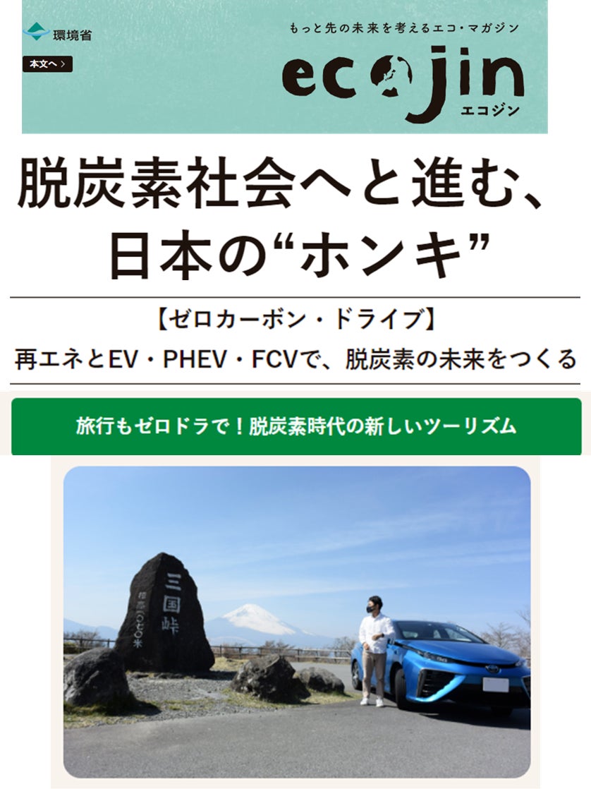 株式会社電力シェアリングでは、過年度のナッジ実証事業において、旅行代理店様(株式会社ジャパトラ)と共同で、EVを用いた「ゼロ旅」を旅行商品として販売する社会実証実験を実施し、環境省のウエブマガジン(ecojin)にも以下のように取り上げていただいています。