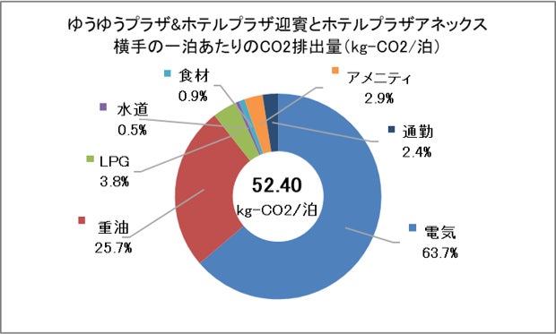 全体としては1室一泊(シングル)あたりの排出量は52kG-CO2となり、国民一人当たりの日常生活での排出量が約5kg-CO2ですので、その10倍となります。