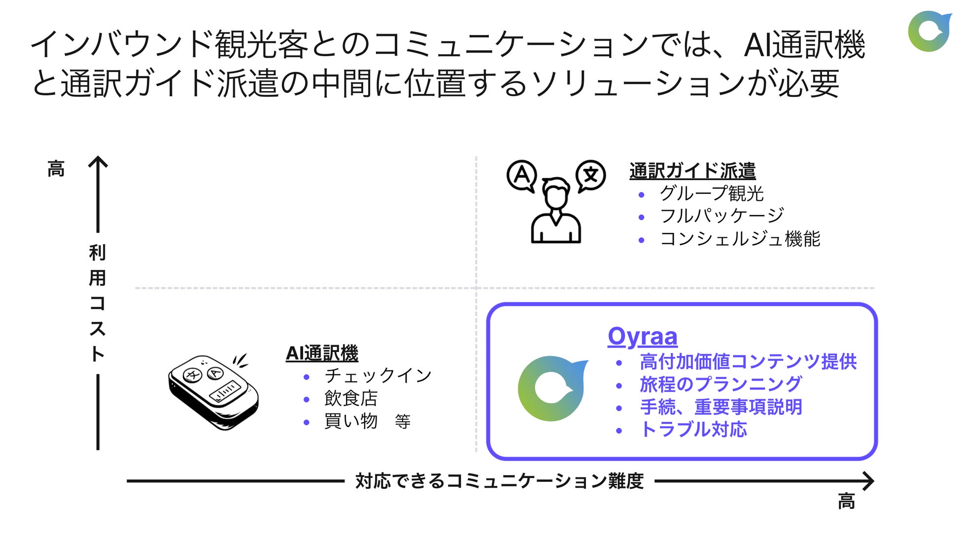 24時間365日いつでも予約不要で通訳者を呼び出し1分単位で利用できる通訳アプリ『Oyraa』を提供。「グローバル通訳者ネットワーク×スマホアプリ」によって、現状のAIでは実現できない高い品質・柔軟性を兼ね備えた ”人間ならでは” の通訳を誰もが簡単に、かつ低コストで利用できるサービスを実現しています。