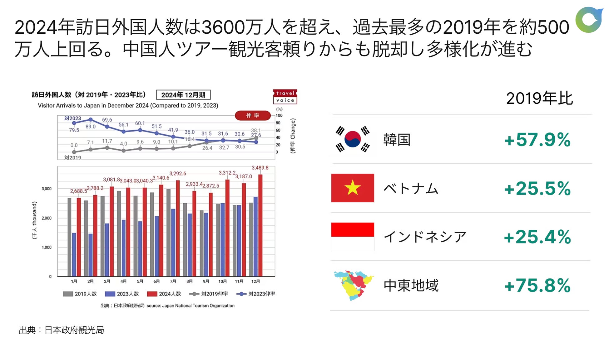 2024年には訪日外国人数が3,600万人を超えました。これは過去最多だったコロナ前の2019年の人数を約500万人上回るもので、インバウンド観光が完全に復調したことを示しています。また、これまで日本のインバウンド観光は中国人団体観光客に支えられてきましたが、現在は中国以外の東アジア・東南アジア、そして中東地域などの成長が著しく、訪日外国人の国籍・言語の多様化が進んでいます。