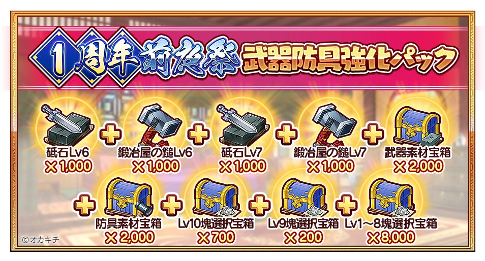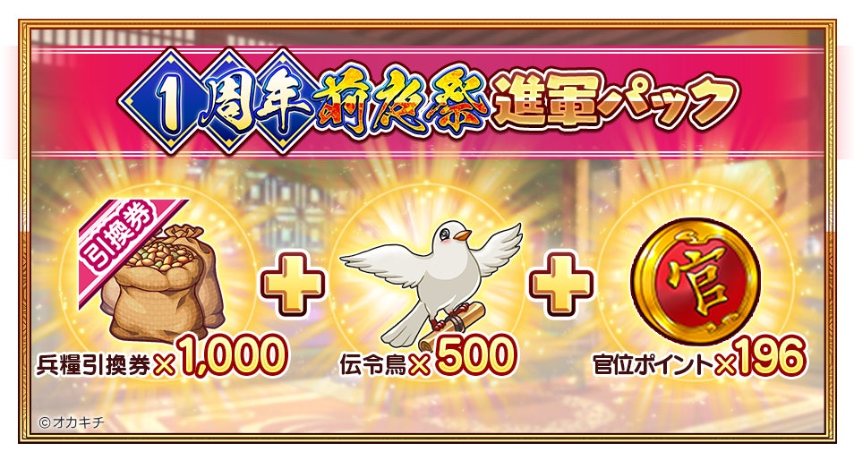 1周年前夜祭の期間中、兵糧引換券や伝令鳩、官位ポイントが大量に入ったプレイに役立つパックや、武器や防具の強化に役立つアイテムが多く入った育成素材のパック等を販売!