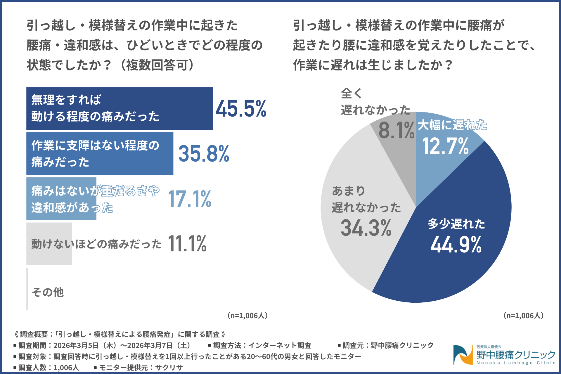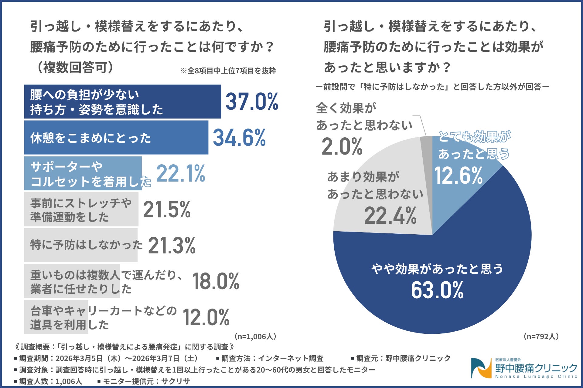 今回、「引っ越し・模様替えによる腰痛発症」に関する調査を実施した野中腰痛クリニック(https://nonaka-lc.com/)は、身体への負担が少ない日帰り可能な腰痛治療を提供しています。