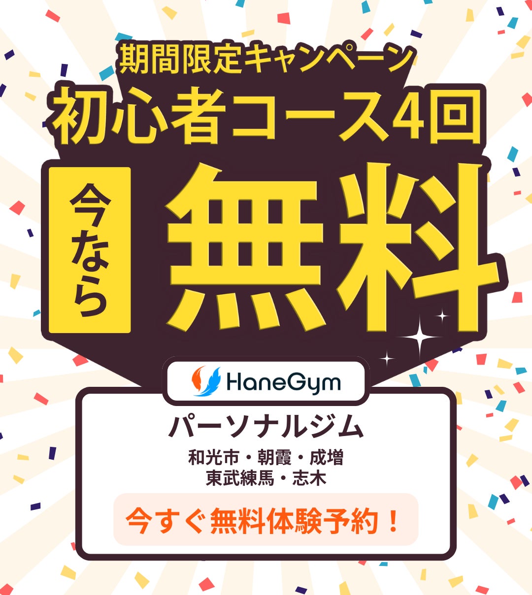 🎉【期間限定キャンペーン】今なら最大21,560円分お得!🎉朝霞駅のパーソナルジム「HaneGym」では、今だけ初心者コース4回が無料になる特別キャンペーンを実施中!