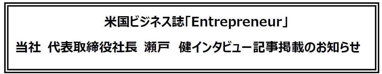 米国ビジネス誌「Entrepreneur」当社 代表取締役社長 瀬戸 健インタビュー記事掲載のお知らせ