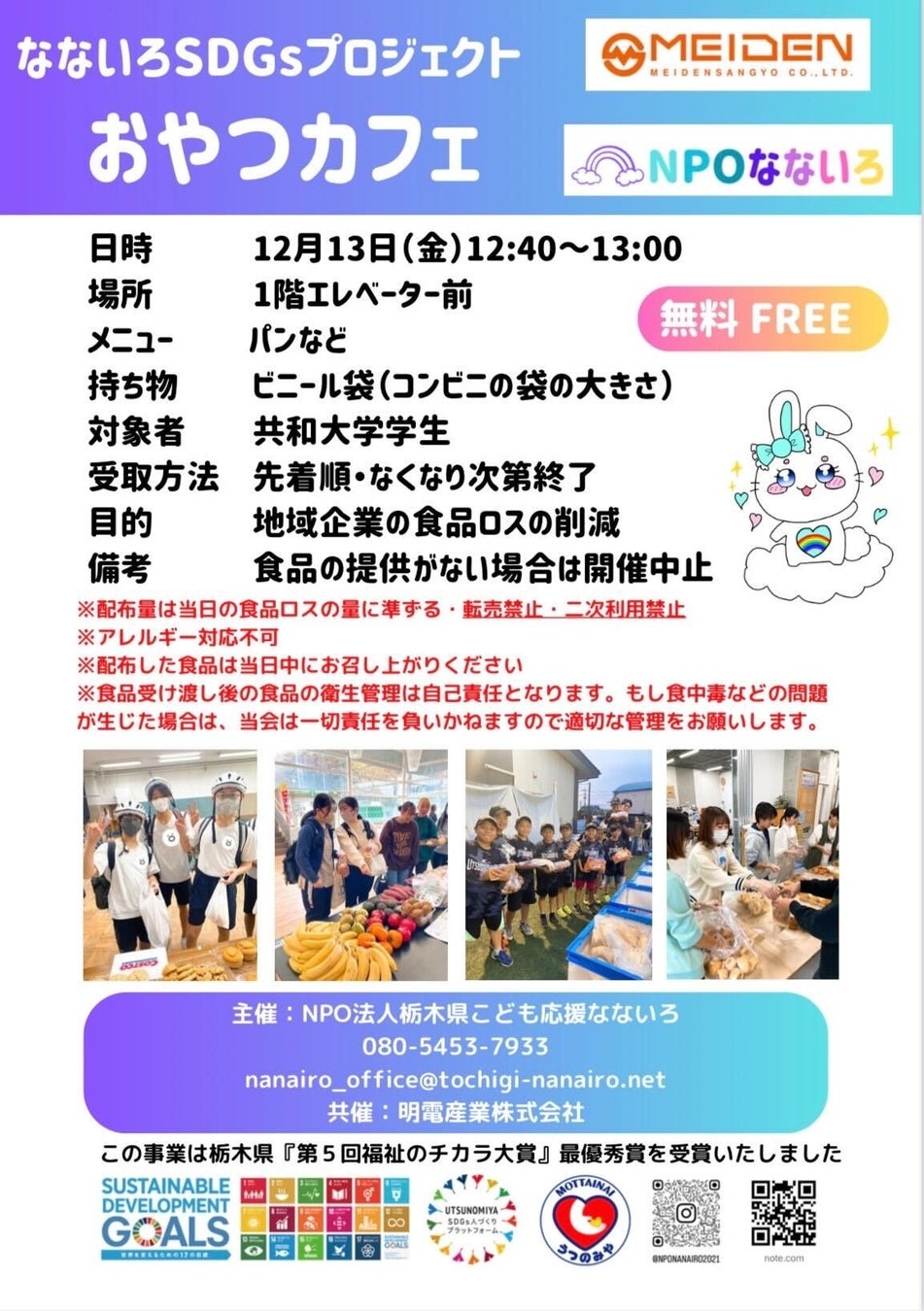 この度、当会食の支援スポンサーである明電産業株式会社様が、NPO法人栃木県こども応援なないろ (事務所 : 栃木県宇都宮市、理事長 : 皆川純子)の食の支援事業『学校内フードパントリー』の運搬業務に、ご協力いただく運びとなりました。
