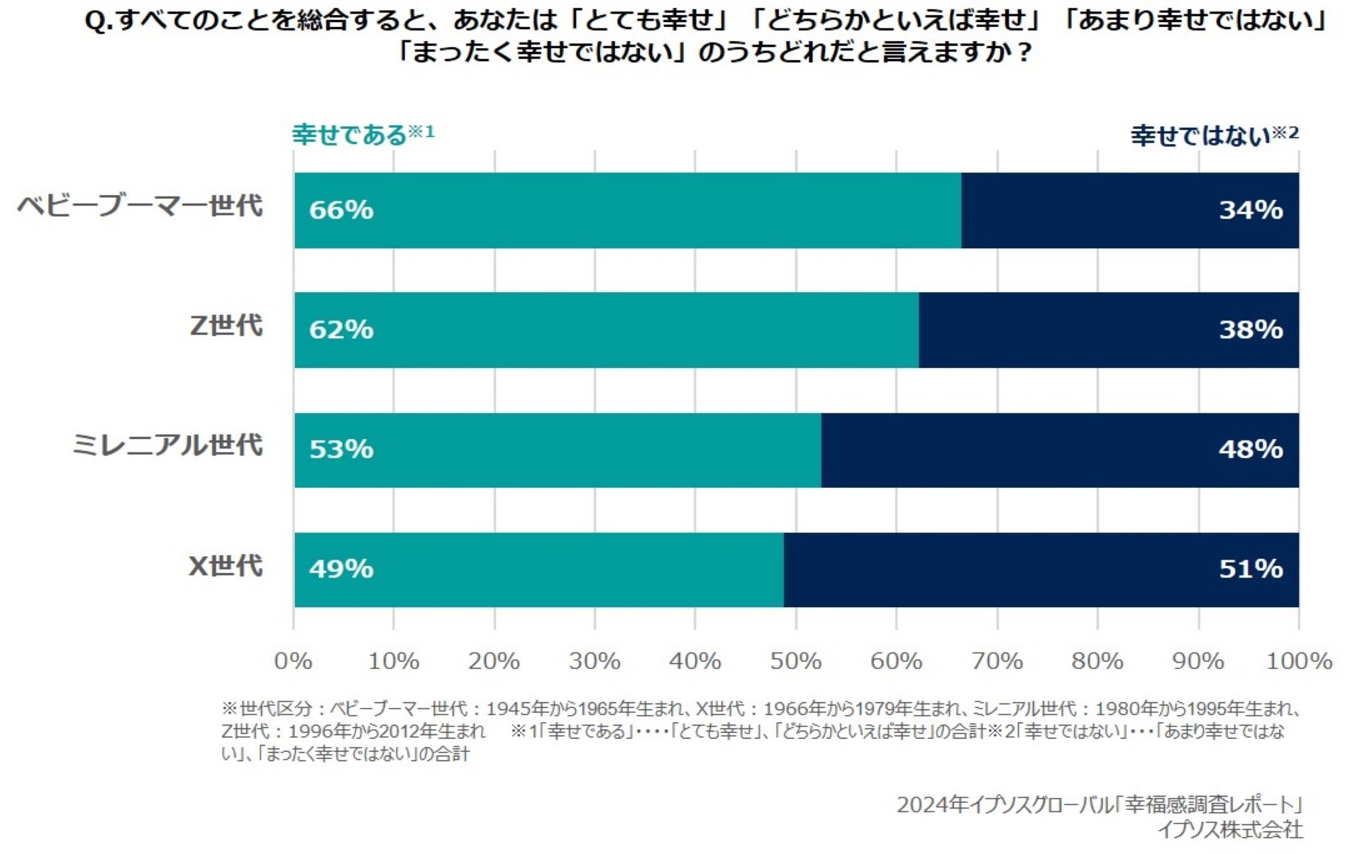 世代別の結果では、「幸せである」と回答した人の割合は、X世代が49%と最も少なく、次いで少ない順に、ミレニアル世代、Z世代、ベビーブーマー世代と続きました。トップと最下位の順位は30カ国のグローバル平均でも同様の傾向が見られました。