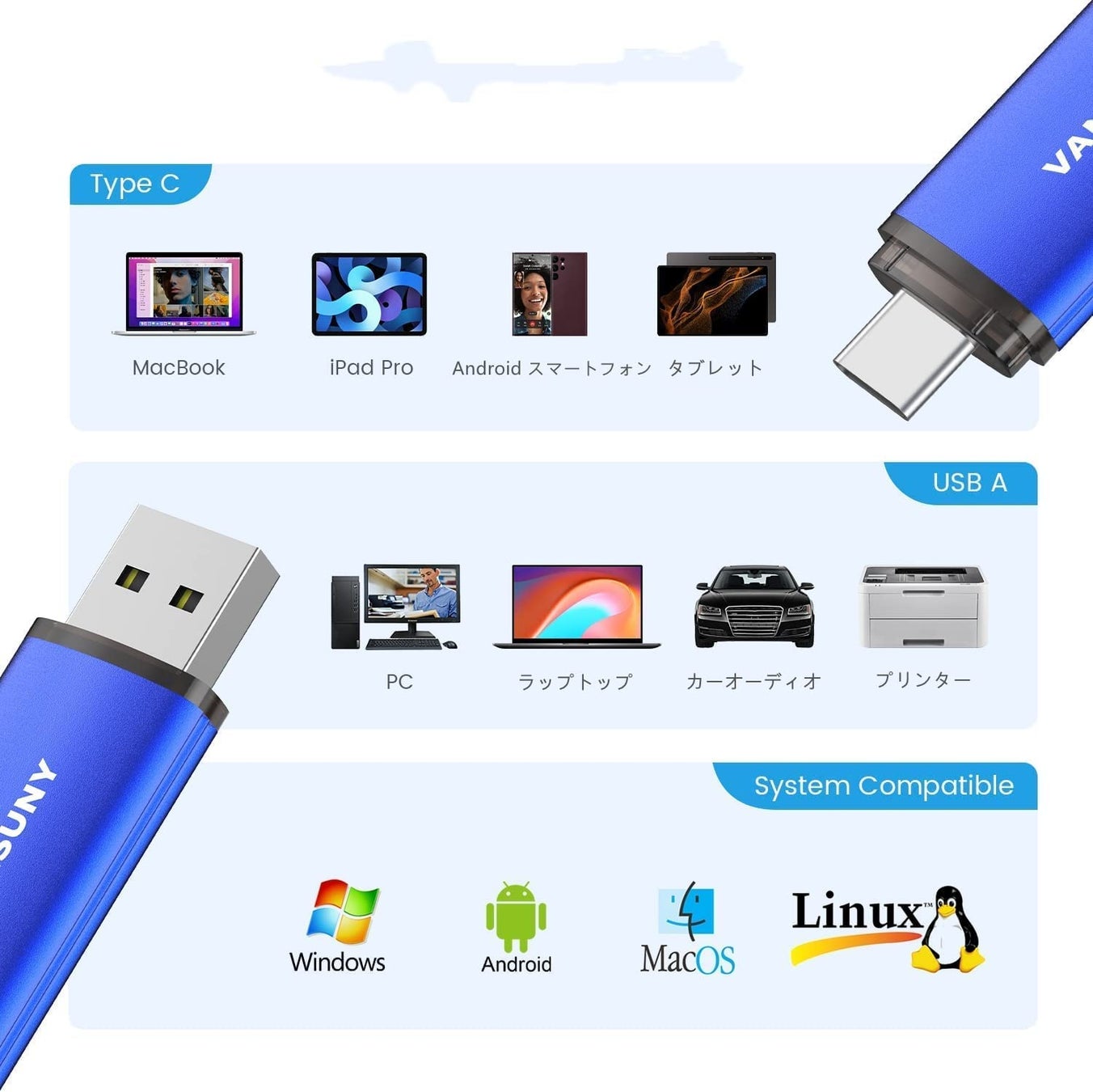 【幅広い用途】 このUSBメモリType Cは、Windows、Android、Linux、および Mac OS で動作します。 コンピュータ、ラップトップ、MacBook、iPad Pro、OTG 対応の Android スマートフォン、タブレットでの使用に最適です。